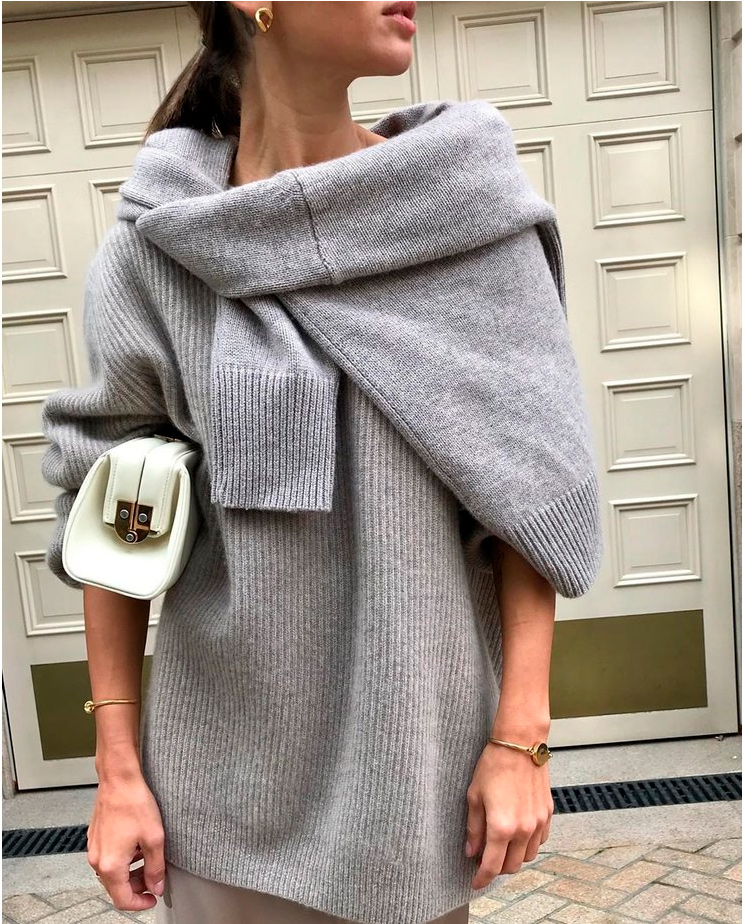 Один из наших любимых способов сочетания — надевать столько трикотажа, сколько возможно. Посмотрите, как стильно выглядит вязаная юбка, джемпер и еще один джемпер, завязанный узлом на плечах.