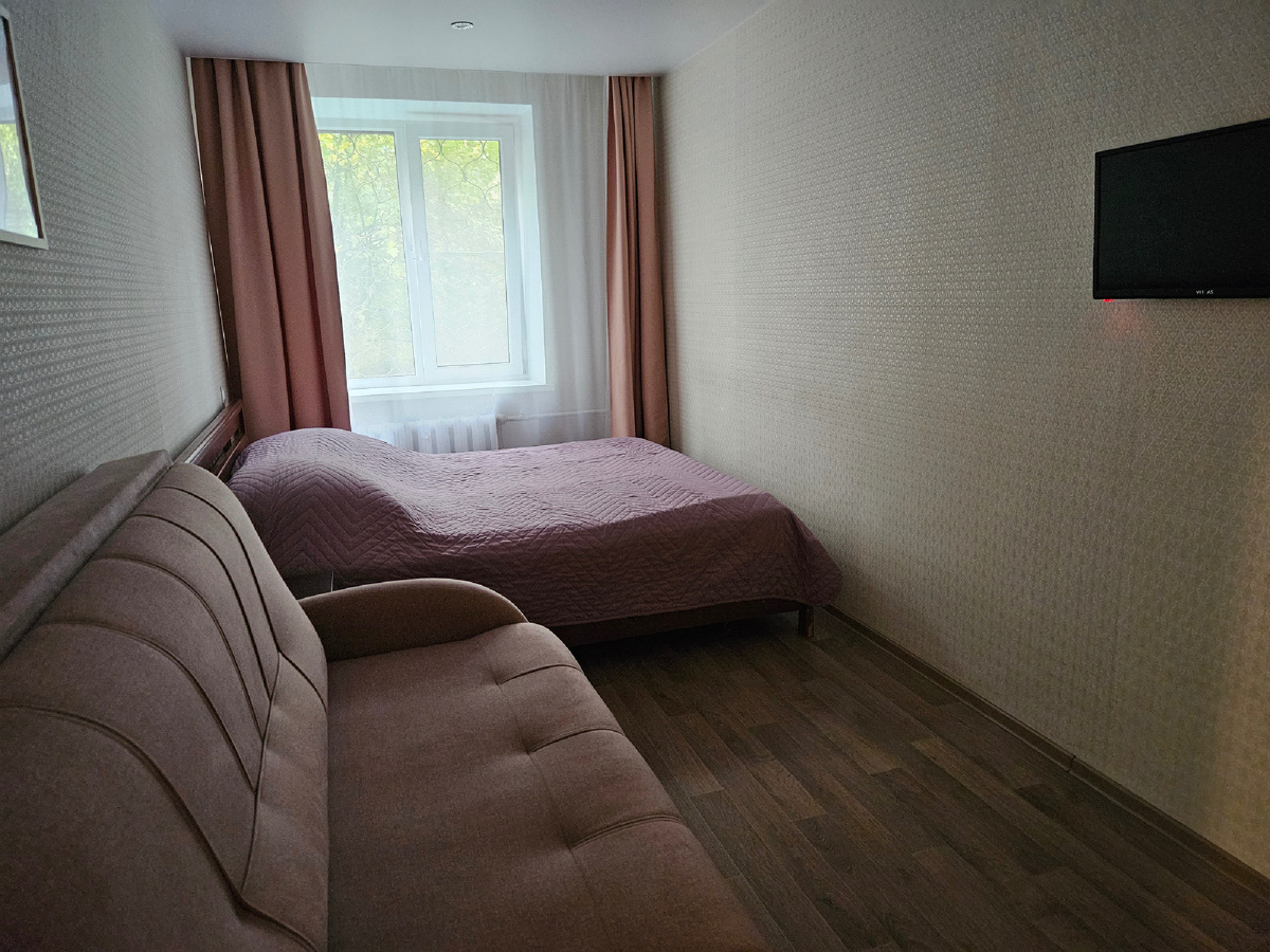 Одна из двух комнат, в другой ещё один диван — максимум 6 спальных мест.