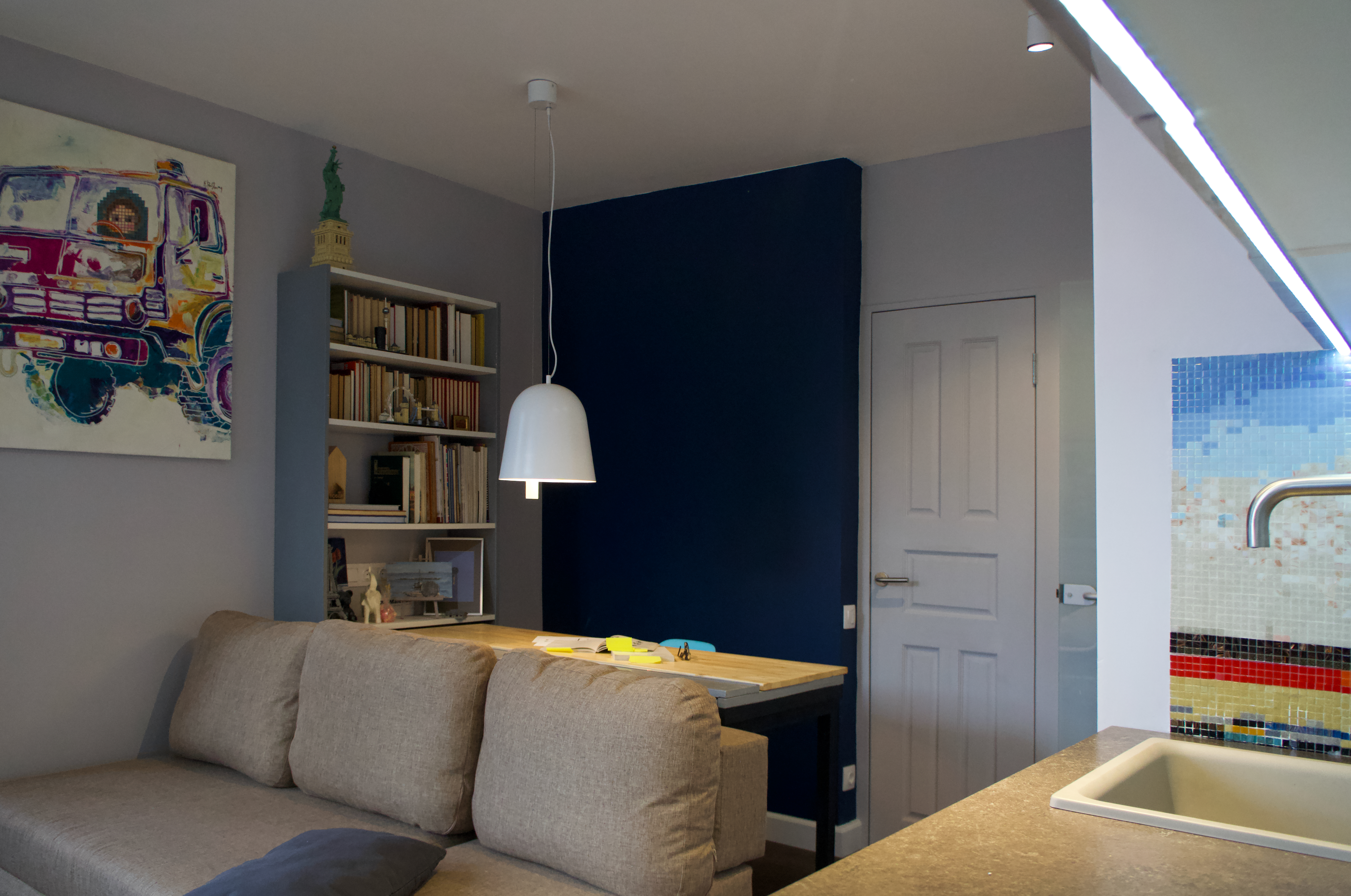 Расскажу о стилистике на примере своей новой квартиры: серый оттенок стен позволил создать ощущение пространства, а контрастный оттенок помогает в зонировании (выделяет зону кабинета).