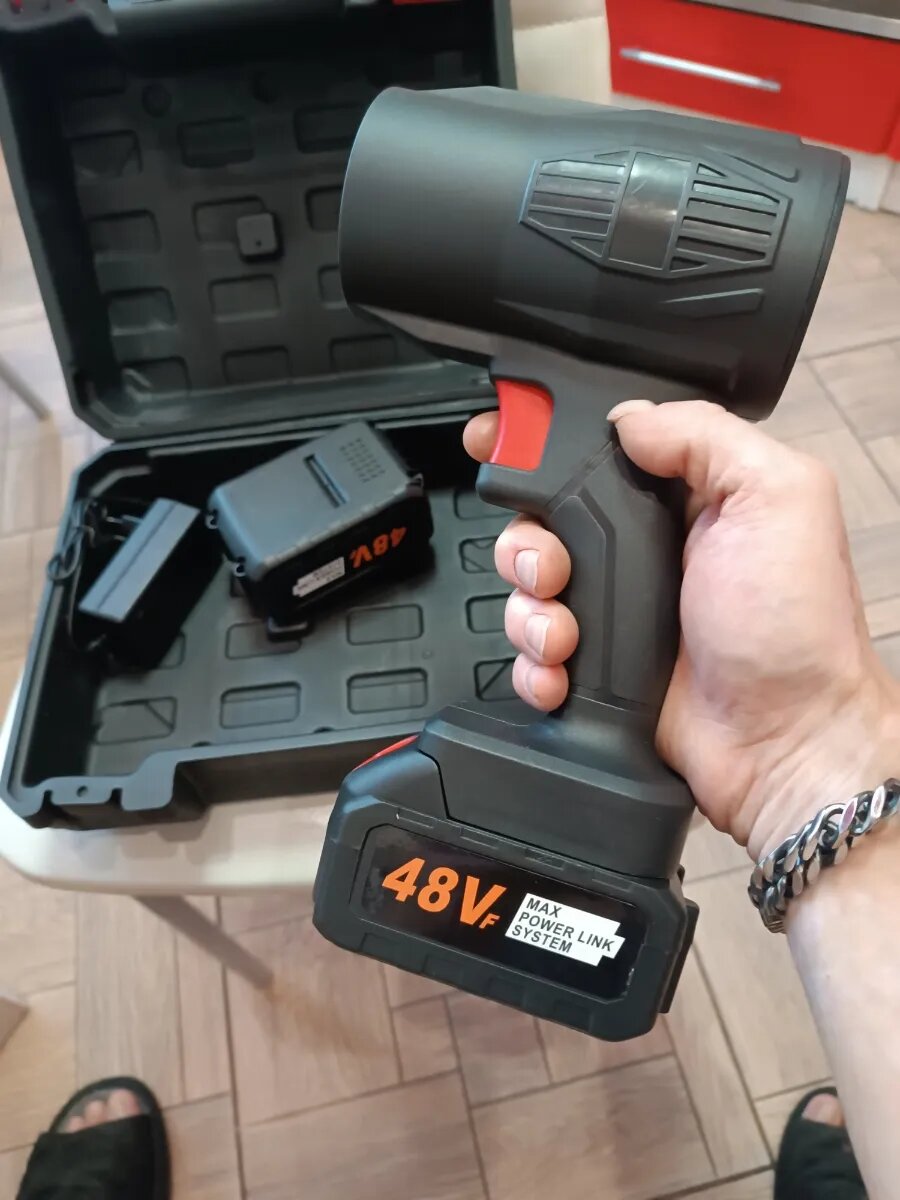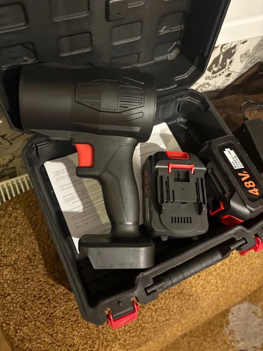 В комплекте, кроме самого «фена», идут две АКБ и зарядное устройство, и все это упаковано в пластиковом кейсе. Мощности вполне достаточно — с бытовым феном не сравнить.