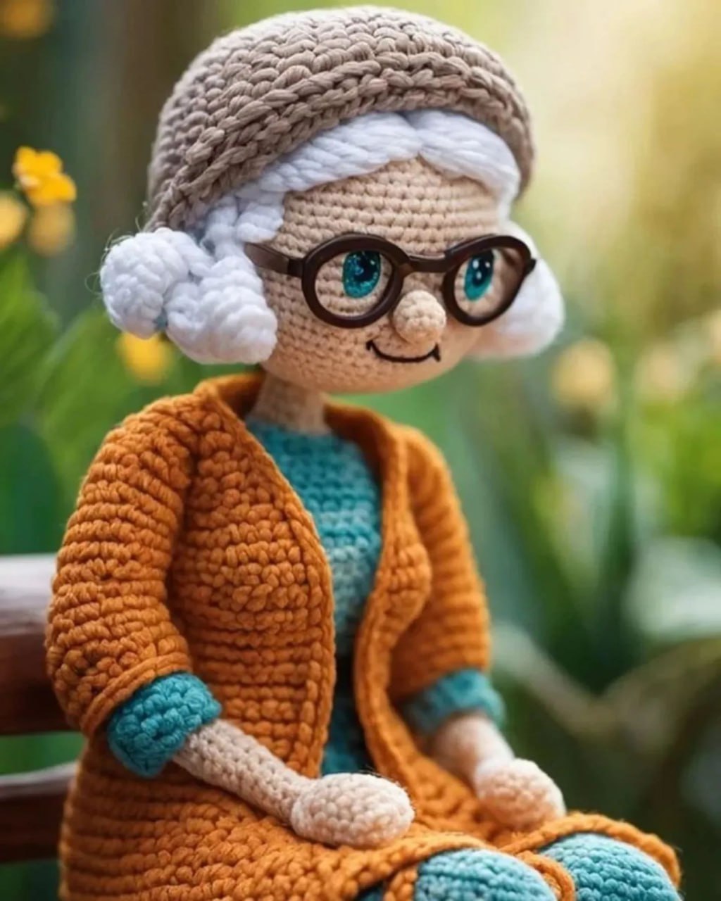 Вспоминается, как бабушка всегда сидела на скамейке в парке, погруженная в чтение своих любимых книг в больших очках. Эта вязаная кукла отражает её доброту и уют, а яркий оранжевый кардиган и голубое платье формируют неповторимый стиль. Особое внимание привлекают аккуратные локоны белых волос и выразительные глаза за очками.