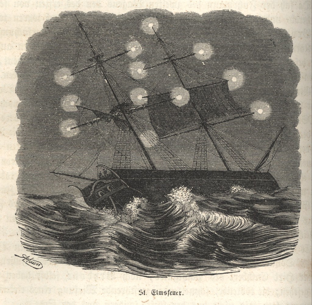 В средние века светящиеся огоньки регулярно наблюдали на шпиле собора святого Эльма в Германии, откуда они и получили современное название. Но есть и альтернативная версия, что святой Эльм (Эразм) умер на корабле во время шторма. По легенде святой всю жизнь молился за моряков и пообещал оказывать им помощь и после смерти.