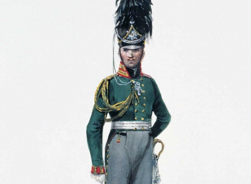 Видим всё те же горизонтальные колонны (на данном рисунке больше похожи на полосы) на воротнике и колонны поменьше на обшлагах рукавов. Возникает вопрос: как и русская, и прусская армия в начале 19 века обзавелась одинаковыми гвардейскими элементами отличия? Здесь все очень интересно!