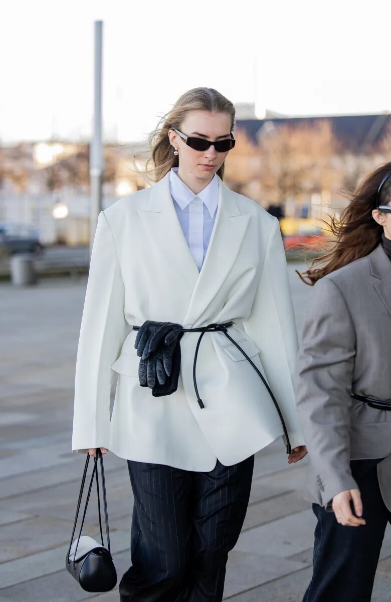 Среди других трендов — тонкий или узкий ремень, который можно носить практически с чем угодно: от платьев, как в подиумном образе Givenchy, до пиджаков и белых рубашек в стиле оверсайз.