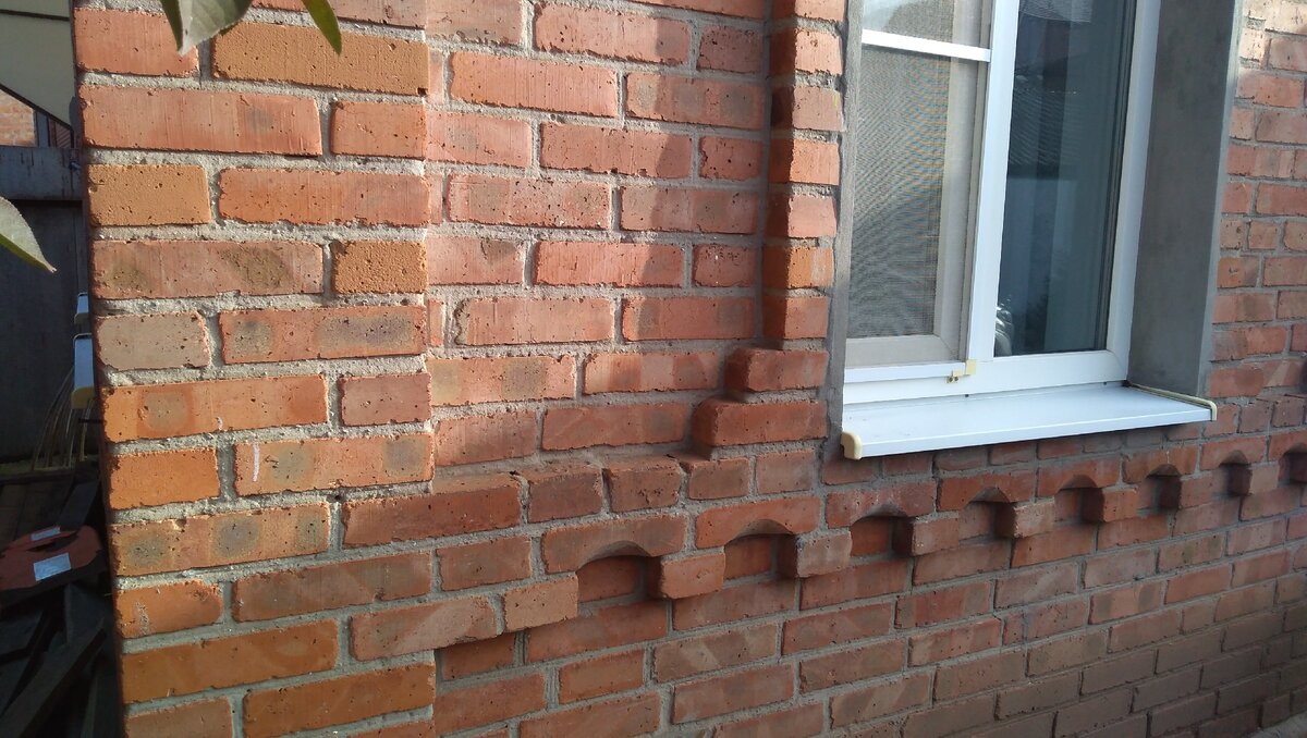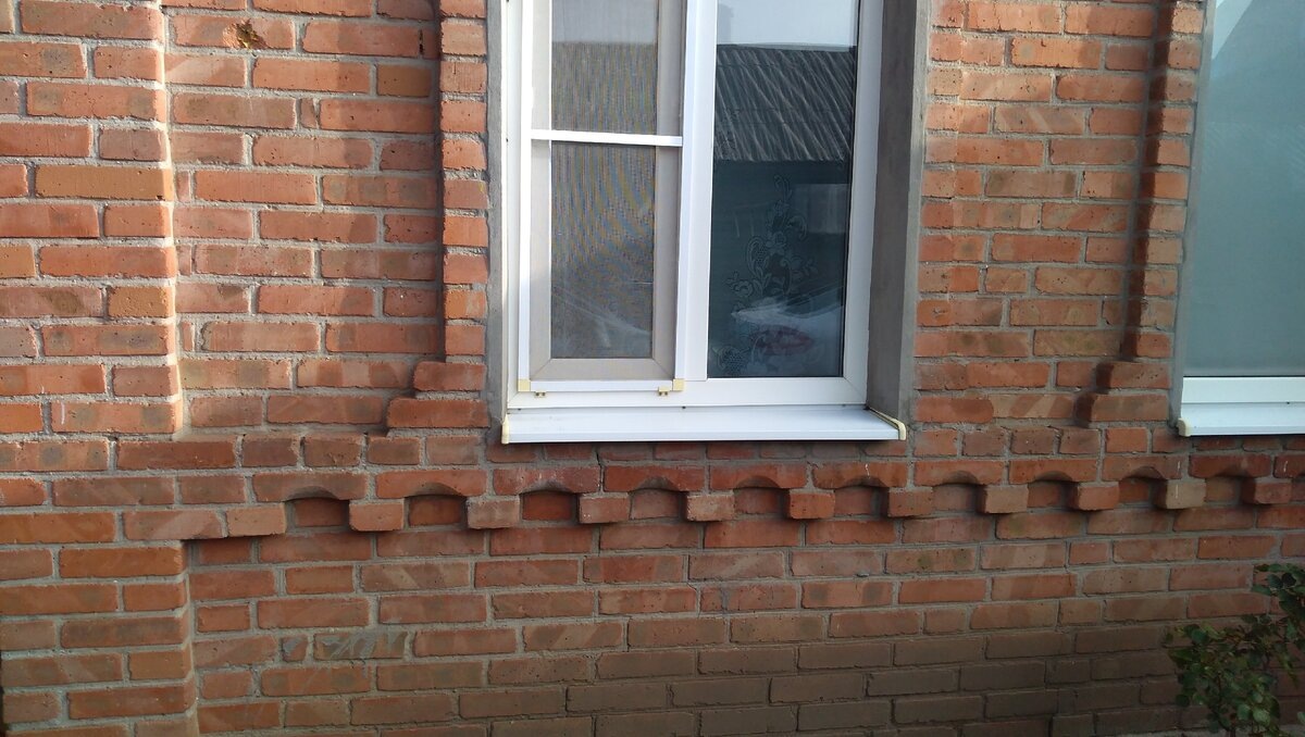 Вот вся суть надежной кирпичной кладки. Дому 48 лет, фундамент глубиной 40 см, выполнен на бутовых камнях. Это при том, что глубина промерзания грунта у нас 1 м.