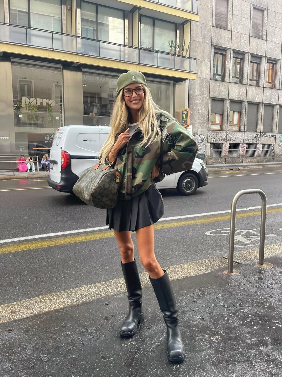Резиновые сапоги в паре с мини-юбкой в складку и полосатым топом. Добавим объемную куртку-бомбер, чтобы придать образу «дикости», а если на куртке яркий принт, например, смелый вариант, то вы уже выиграли в игре впечатлений. Это идеальное сочетание женственности и уличного стиля. Потому что, черт возьми, нет ничего сексуальнее, чем женщина, которая умеет играть по правилам, в сапогах, которые когда-то ненавидела.