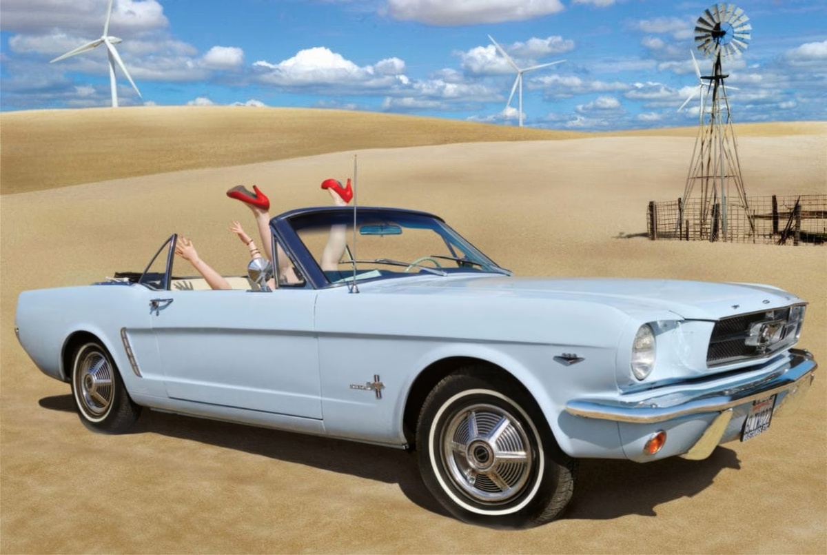 Кабриолет в пустыне, из которого вверх торчат женские ноги в красных туфлях – идеальный пример его ироничного подхода к изображению роскоши и свободы.