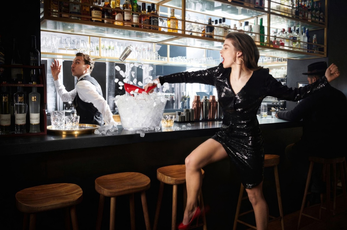 Бар, ледяной контейнер, женщина в сверкающем платье, бросающая что-то в официанта – здесь присутствует энергия, кинематографичность и ощущение момента.