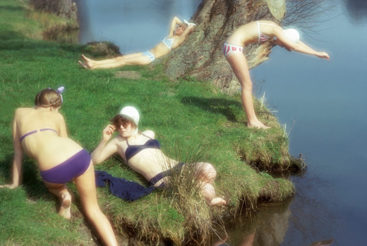 Девушки в ретро-купальниках у воды, где один из персонажей будто случайно теряет равновесие и падает в реку – сцена, наполненная юмором и неожиданностью.