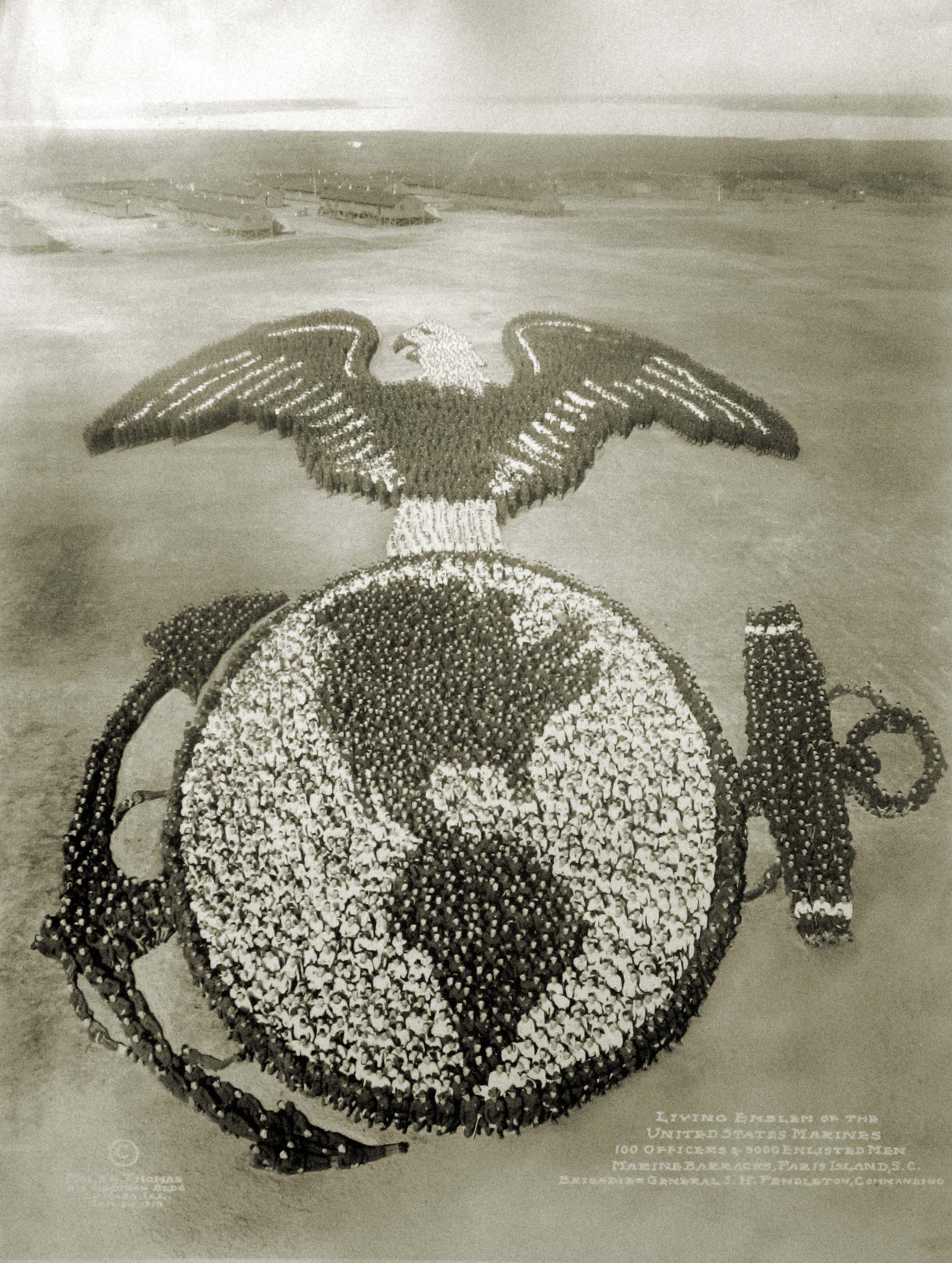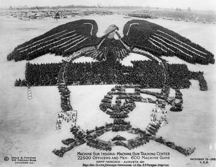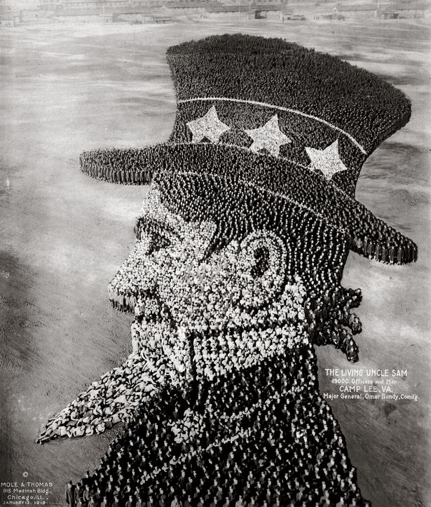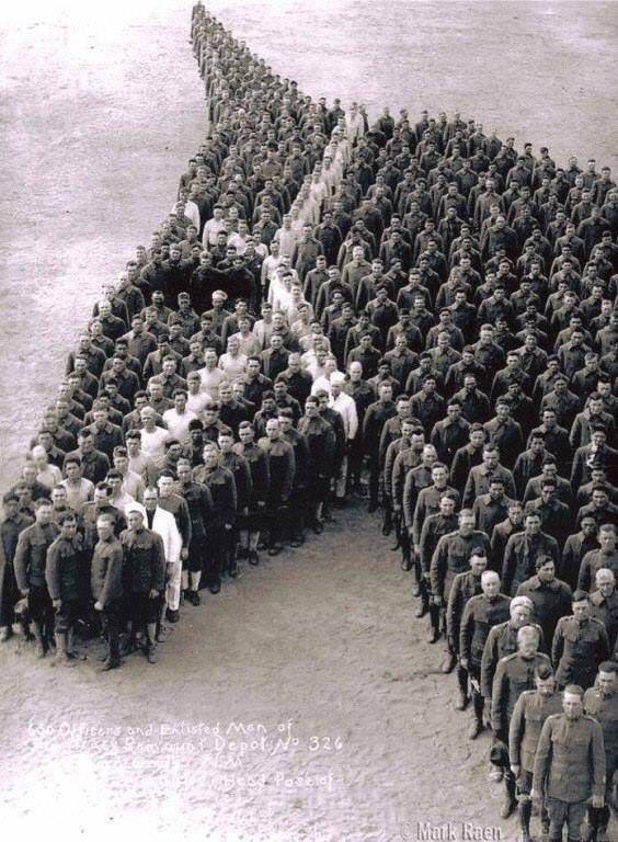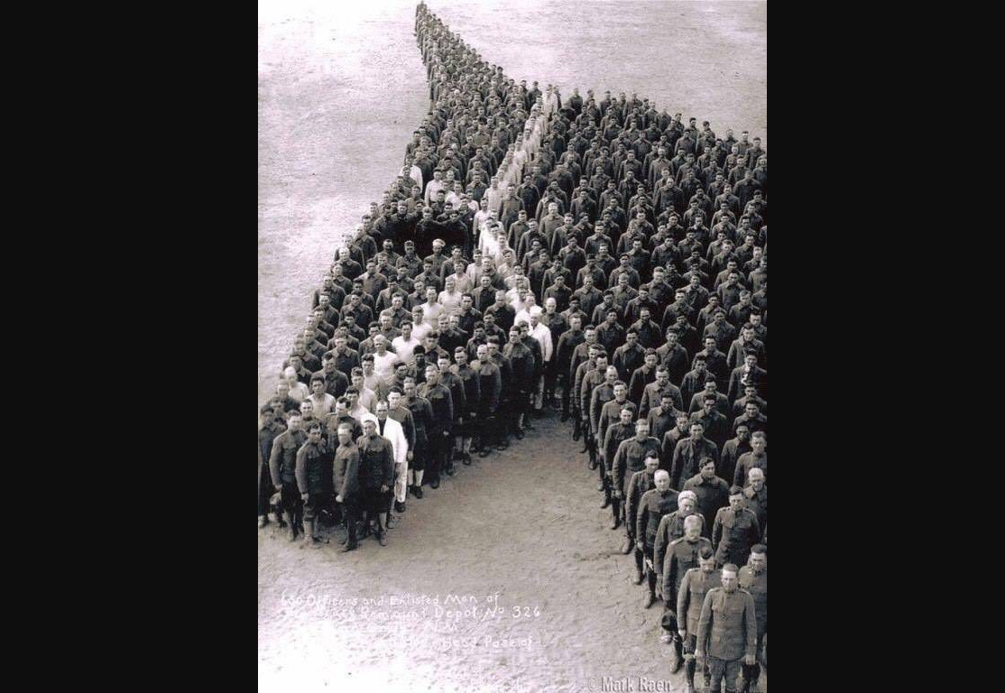 Уже много лет это фото с вводящими в заблуждение подписями кочует по сайтам и страницам пользователей соцсетей. На самом деле этот снимок сделан Ньюманом в Кэмп-Коди в январе 1919 года (а не в 1917 году). На фотографии изображены 650 офицеров и рядовых из конного депо № 326 службы переоснащения армии США, которая занималась обучением и поставкой лошадей для военных.