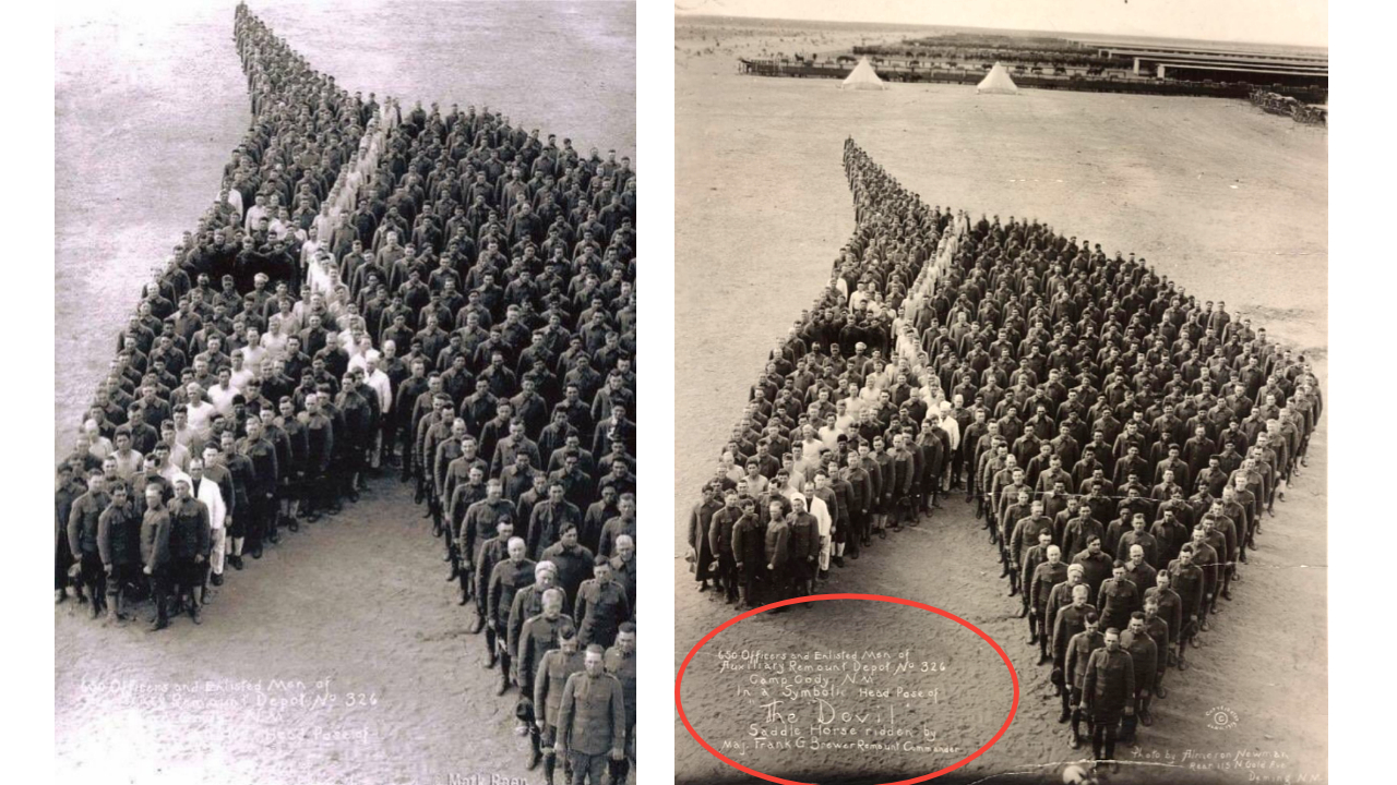 Участники группового снимка выстроились в виде лошадиной головы. Причем не какой-то абстрактной, а вполне конкретной верховой лошади по кличке «Дьявол» некоего майора Фрэнка Дж. Брюэра, командующего этим подразделением. Об этом вполне ясно говорит подпись на самом фото, которую кто-то заботливо затёр перед размещением в соцсетях: