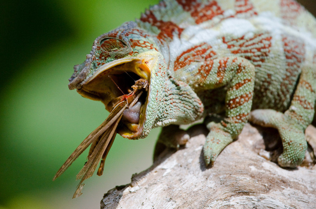 Теперь поговорим о том, как хамелеон охотится. И тут он является самым быстрым стрелком на диком западе. Клинт Иствуд нервно курит в сторонке, ведь язык хамелеона выбрасывается на свою максимальную длину (а это почти как длина тела, если не больше) за 1/20 секунды, после чего возвращается в кобуру примерно за 0,5 секунды. Таким образом, путем несложной математики, которую ты, конечно, не выучил, можно сказать, что хамелеон за 3 секунды может делать до четырех убийств.