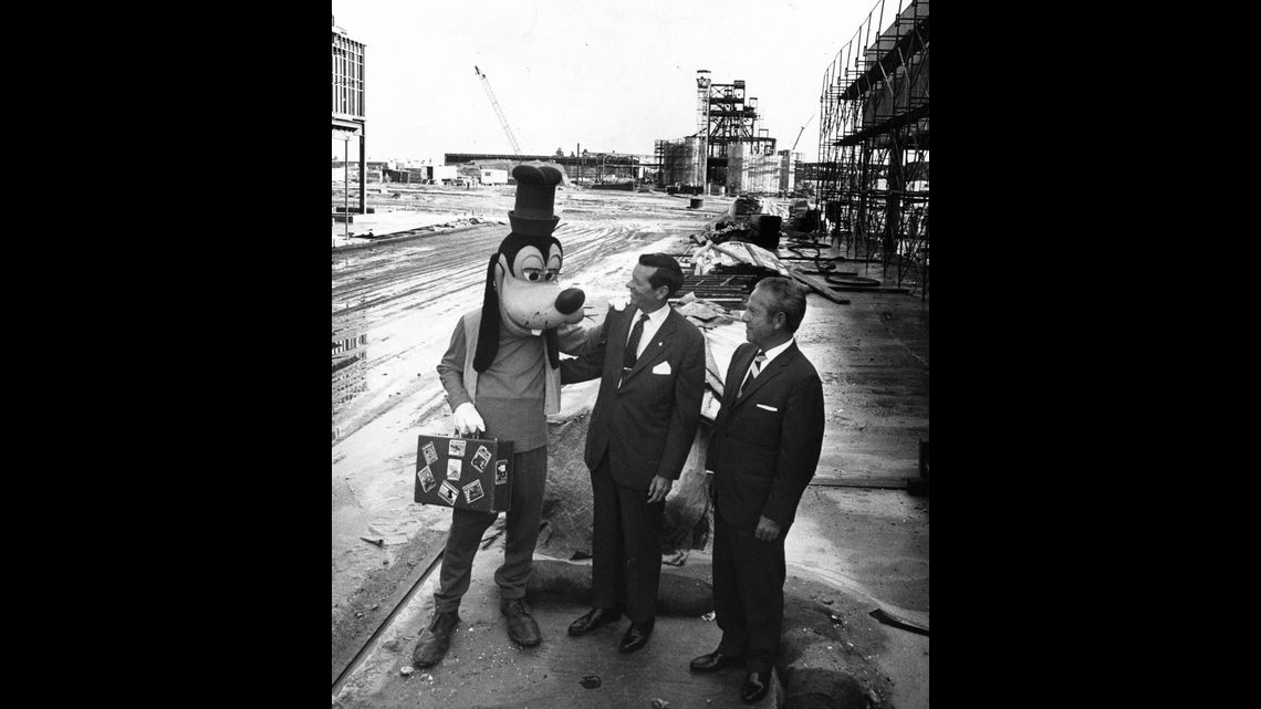 Гуфи, Лангхорн Уотрун, US Travel (в центре) и генерал У. Е. Поттер, вице-президент Walt Disney World (справа) во время строительства главной улицы парка, 1970 год.
