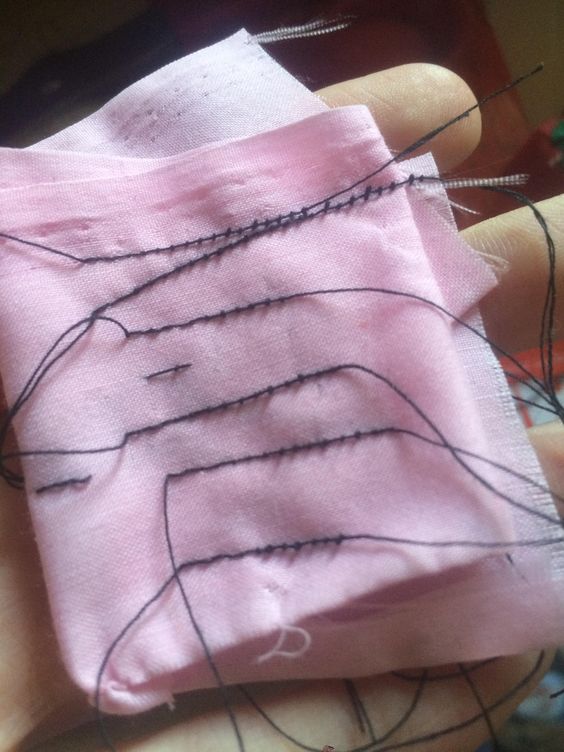 Когда речь идет о машинной строчке, я бы хотела, чтобы вы представили цепочку. Существует верхняя нить и нижняя (нить на шпульке). Эти нити сцепляются в ткани через равные промежутки (каждый стежок).