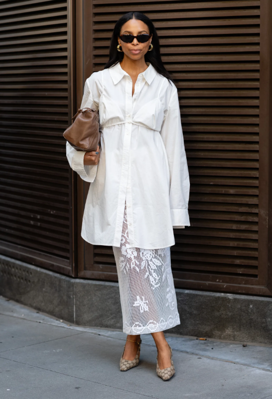 Кружевные юбки и прозрачные ткани в сочетании с платьем-рубашкой выглядят очень скромно