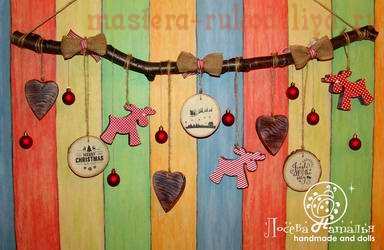 Располагаем готовые игрушки под березовой веткой так, как они позже будут висеть на гирлянде. При этом стараемся разместить их так, чтобы ни один элемент не находился на одном уровне с другим.