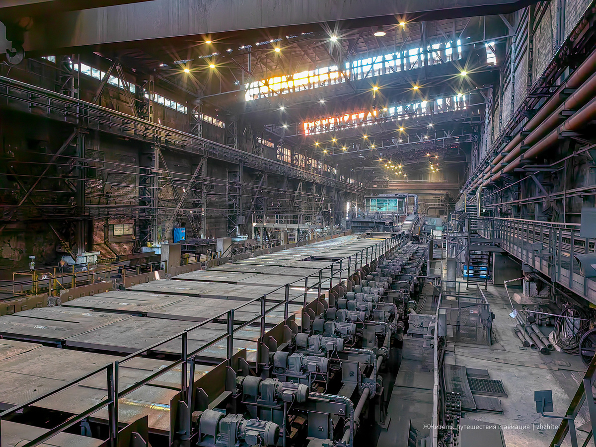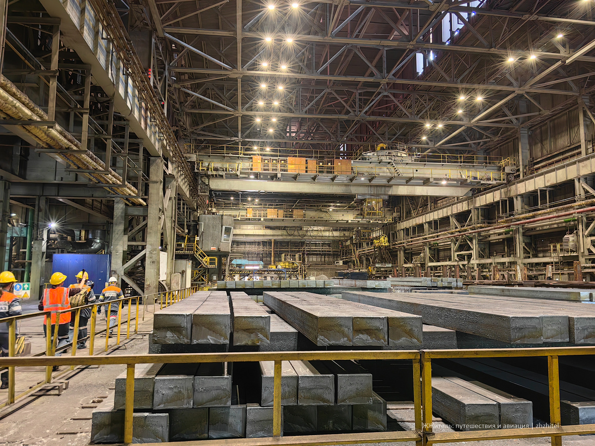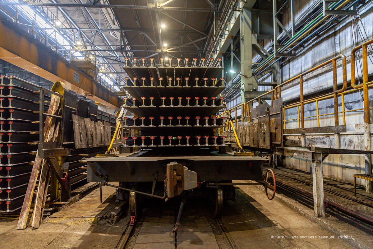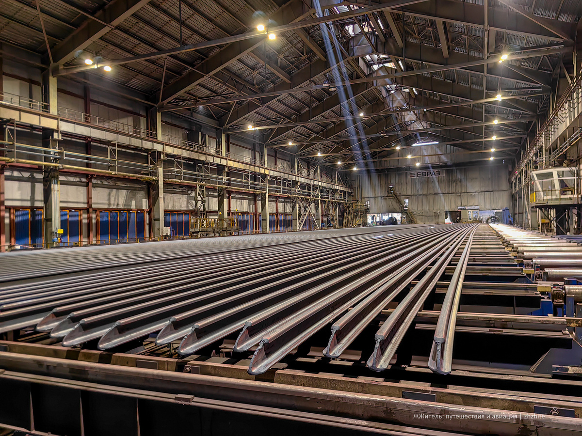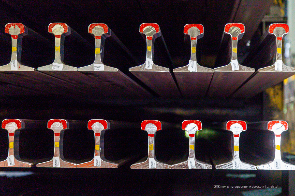 Рельсобалочный цех поражает своими размерами. Заготовки для рельсов поступают в виде стальных параллелепипедов длиной около 8 метров. В зависимости от типа рельса марки стали отличаются. Есть рельсы для движения скоростных поездов, есть рельсы для районов с холодным климатом, для метрополитена и так далее.