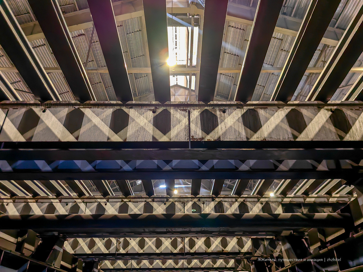 Если посмотреть снизу на эти уходящие вдаль линии рельсов и балок, это очень красиво выглядит. Геометрия, уходящих в перспективу рельс, и игра на них света и тени завораживают.