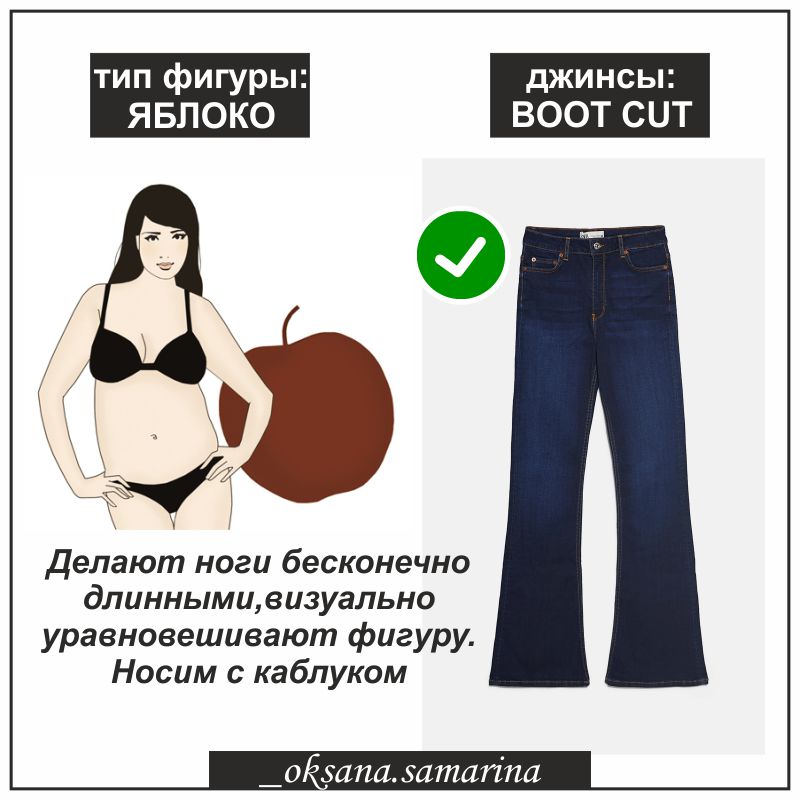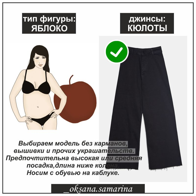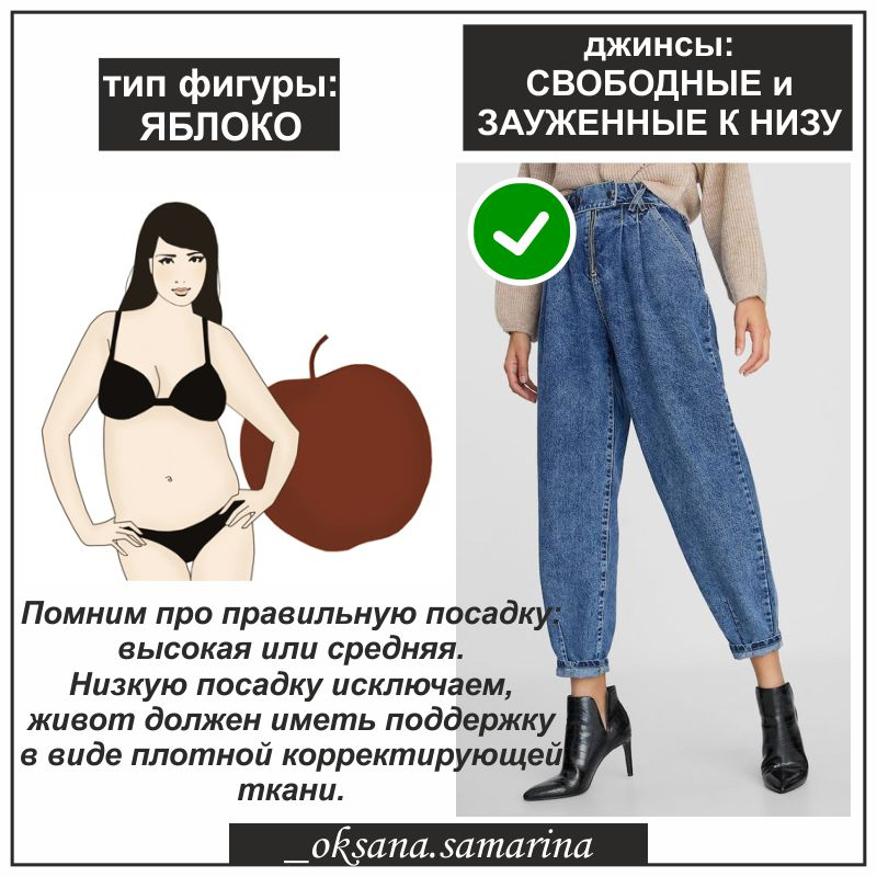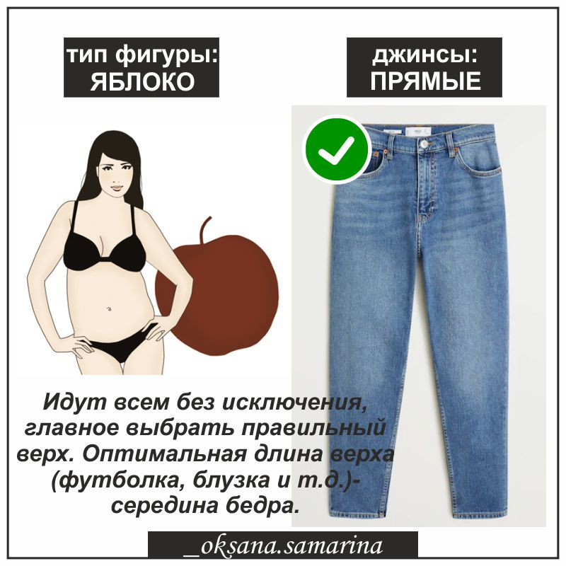 Сегодня я расскажу, как обладательницам фигуры «яблоко» среди огромного ассортимента джинсов найти идеальную пару. Как правило, у женщин такого типа стройные ноги, а объем сосредоточен вверху, отсутствие изгиба в талии и заметный животик.