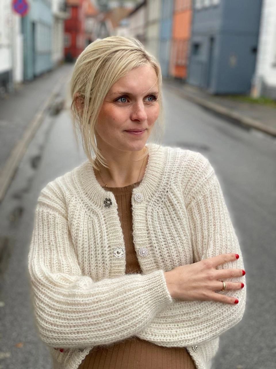 Уютный и мягкий кардиган, выполненный спицами из легкого мохера. Его особенность — крупные декоративные пуговицы с узорчатой отделкой, которые придают изделию элегантный вид. Прекрасный выбор для прохладных дней и стильных луков.