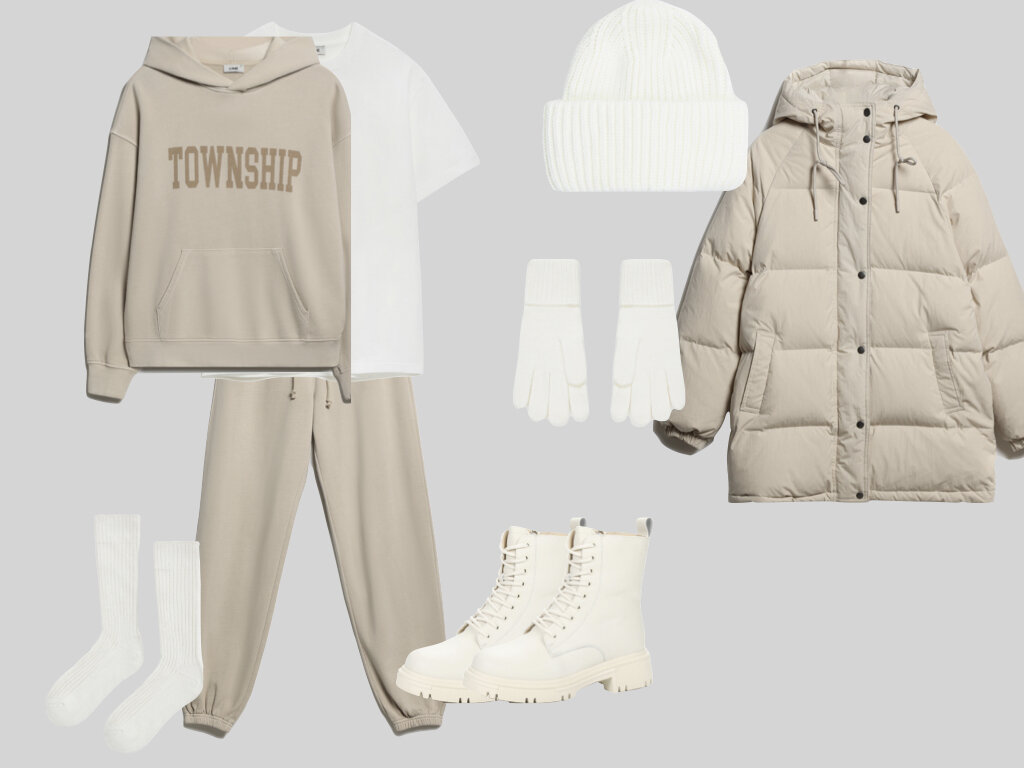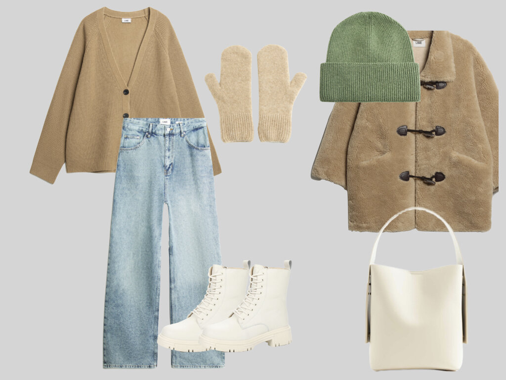Я покажу вам образ с разноцветными аксессуарами , но сюда можно взять и просто молочные или бежевые. Мне захотелось добавить акцента с помощью шапки, но это, конечно, опционально.