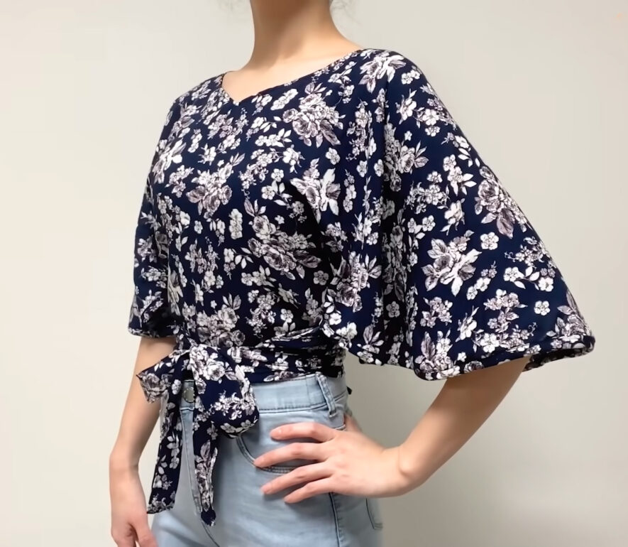 Сегодня я решила попробовать свои силы на этом куске ткани и создать из него стильную блузку с рукавами-бабочками. Длина рукавов достигает локтя. Эту блузку можно носить летом с шортами, юбкой или брюками. Она скроена целиком из одного куска ткани с вырезом для головы и пришитыми завязками. Это отличный вариант для новичков и для тех, кто не хочет заниматься выкройками.