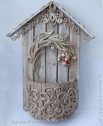 Представляем вашему вниманию мастер-класс по изготовлению удивительной ключницы, декорированной джутовой филигранью. Для оформления ключницы использована роспись, имитирующая старую доску, а также имитация резьбы по дереву с помощью джутовых нитей.