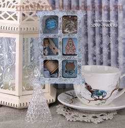 Самая простая в исполнении — игрушка из обычной прямоугольной рамки. Я не разбивала коробочку на отсеки. Хотелось создать легкую как в исполнении, так и в восприятии игрушку. Поэтому выбор пал на цветовую гамму белый+серо-голубой. Декор минимален — несколько завитушек, деревянная прищепка, шебби-ленточка, маленькая вязаная снежинка и картинка с зайкой. Подвеска — серая атласная ленточка в горошек. Пикантная деталь — буклированная тесьма (можно использовать кружево) белого цвета. Я приклеила её с обратной стороны рамки.
