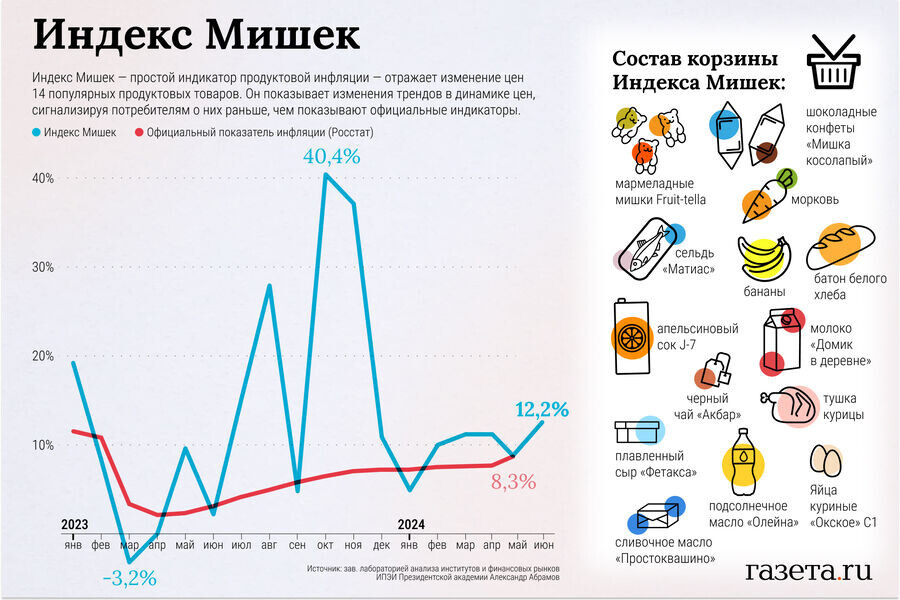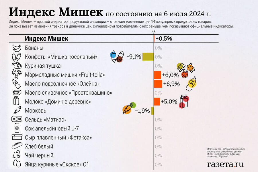 По расчётам Абрамова, в июне текущего года к июню 2023-го снизились цены лишь на два товара из индекса — конфеты «Мишка косолапый» (- 33,6%) и морковь (-21,1%). На все оставшиеся 12 товаров цены выросли. Самый высокий рост цен за год наблюдался на бананы (+41,9%), масло сливочное «Простоквашино» (+32,3%), сельдь «Матиас» (+22,7%), сок апельсиновый J7 (+22,3%), чай черный «Акбар» (+20,6%) и мармелад Frit-Tella (+17,8%).