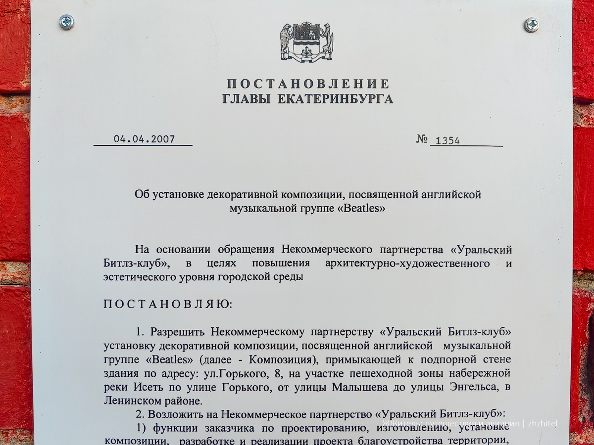 Памятник получился очень стильным, под стать группе. Из кирпичной стены выступают чугунные силуэты музыкантов. Разрешение на установку «декоративной композиции, посвященной английской музыкальной группе «Beatles» подписал глава Екатеринбурга, а денежные средства в размере 2,5 миллионов рублей собирали всем миром.