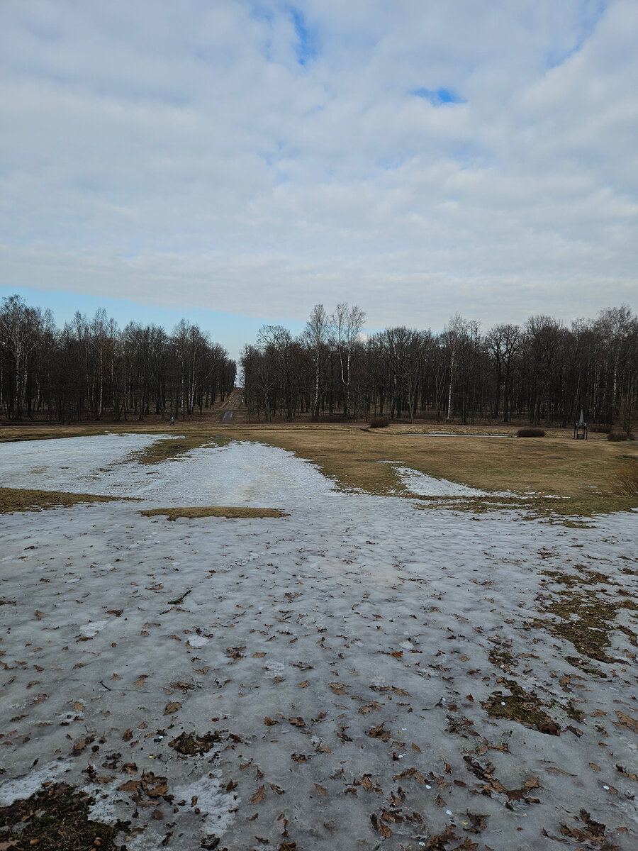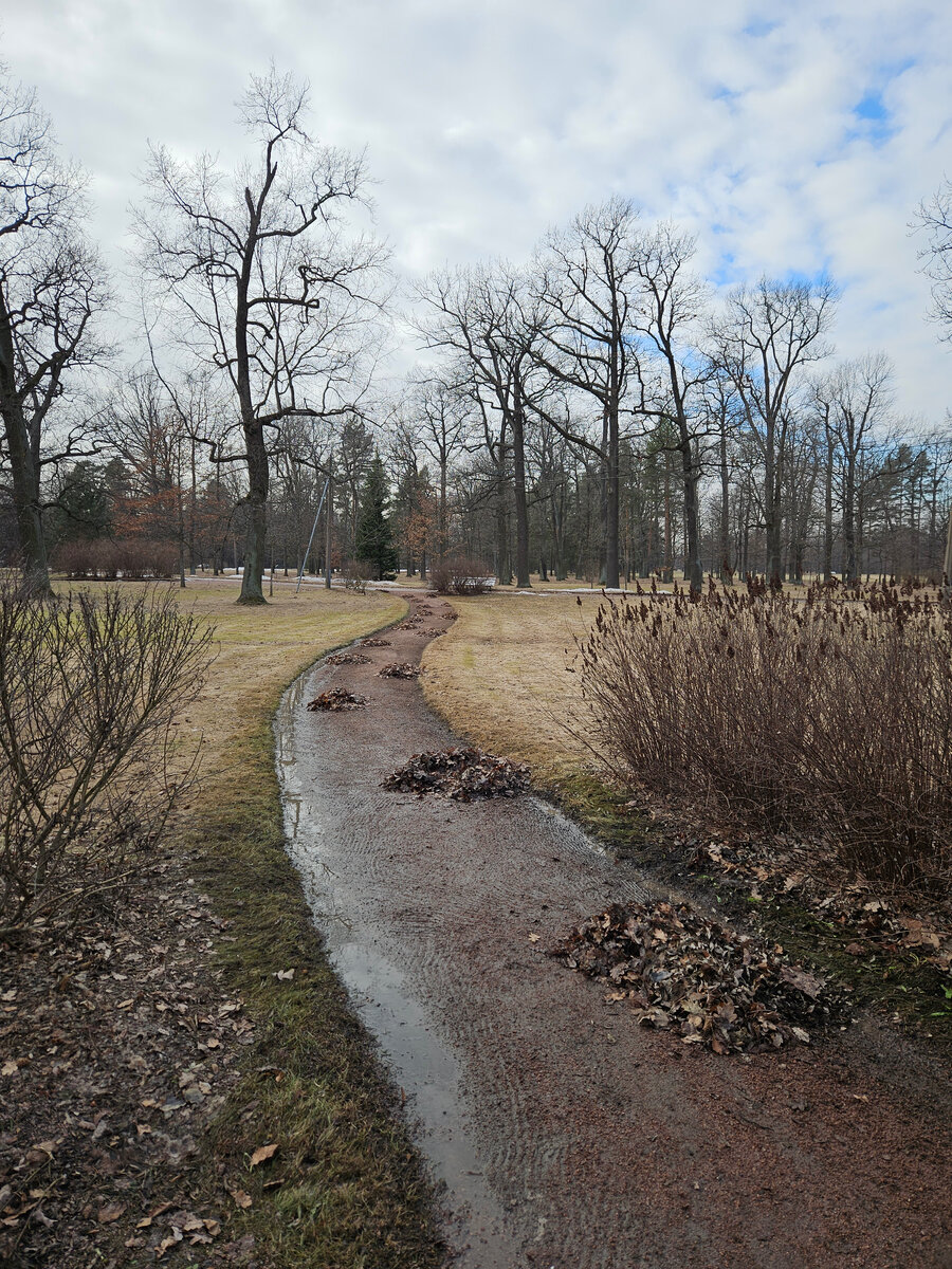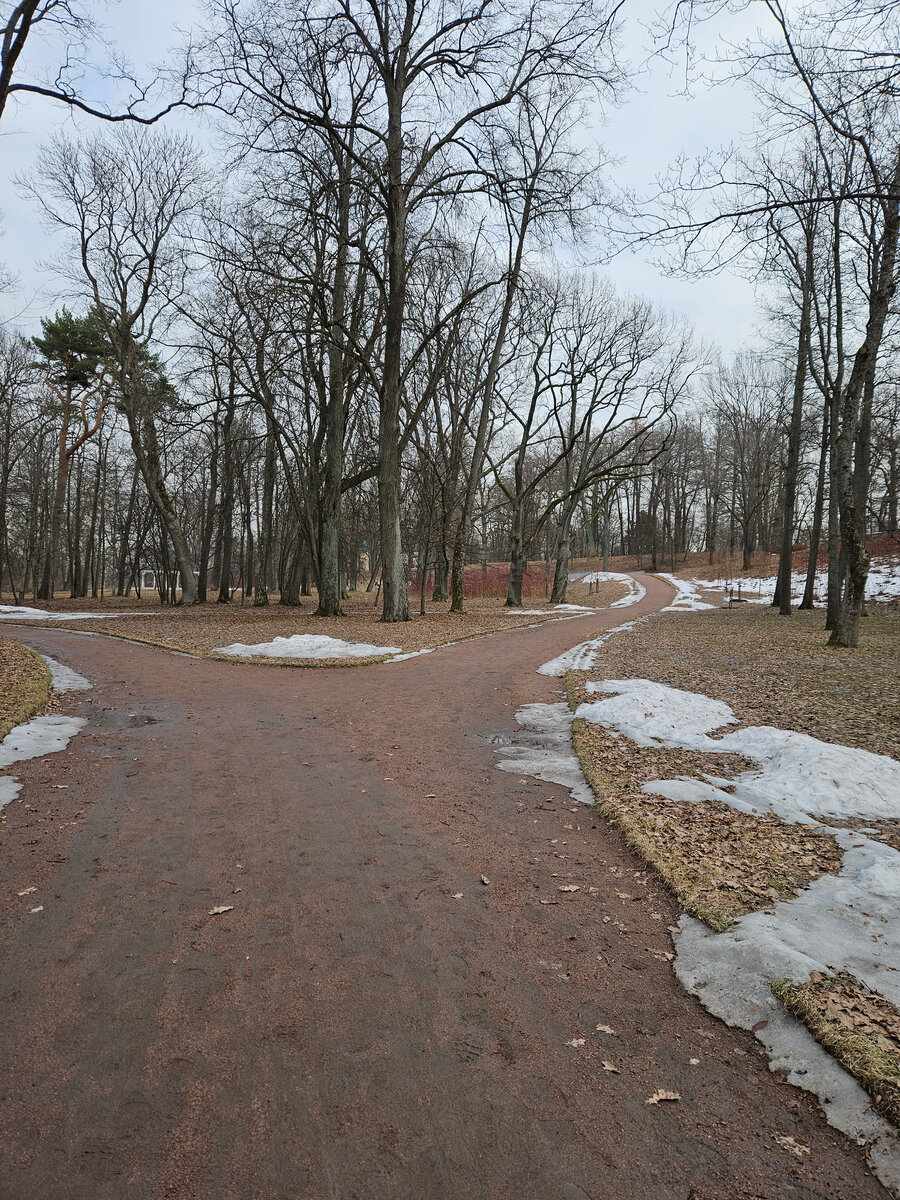 Я приезжала сюда в середине марта. Снег полностью ещё не сошёл, парк не просох. Я была в походных ботинках, и это меня выручило: дорожки мокрые, много грязи, на просушку была закрыта только одна дорога.