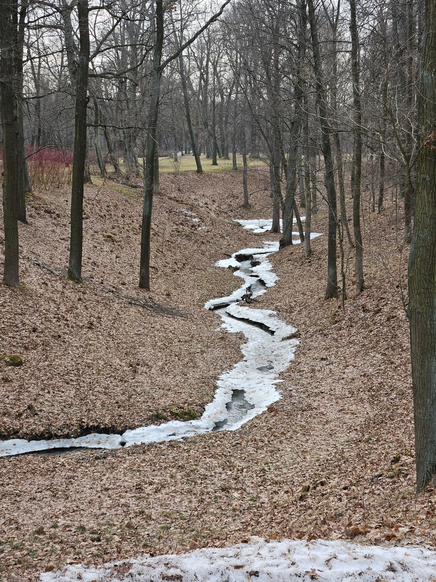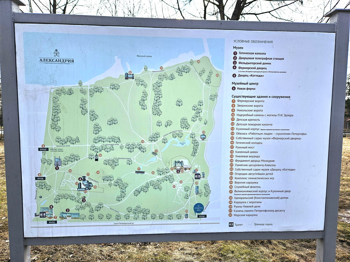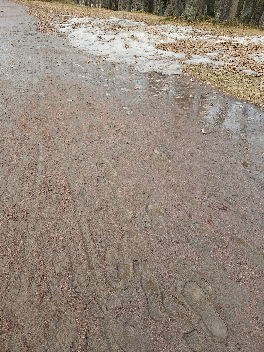 Я приезжала сюда в середине марта. Снег полностью ещё не сошёл, парк не просох. Я была в походных ботинках, и это меня выручило: дорожки мокрые, много грязи, на просушку была закрыта только одна дорога.