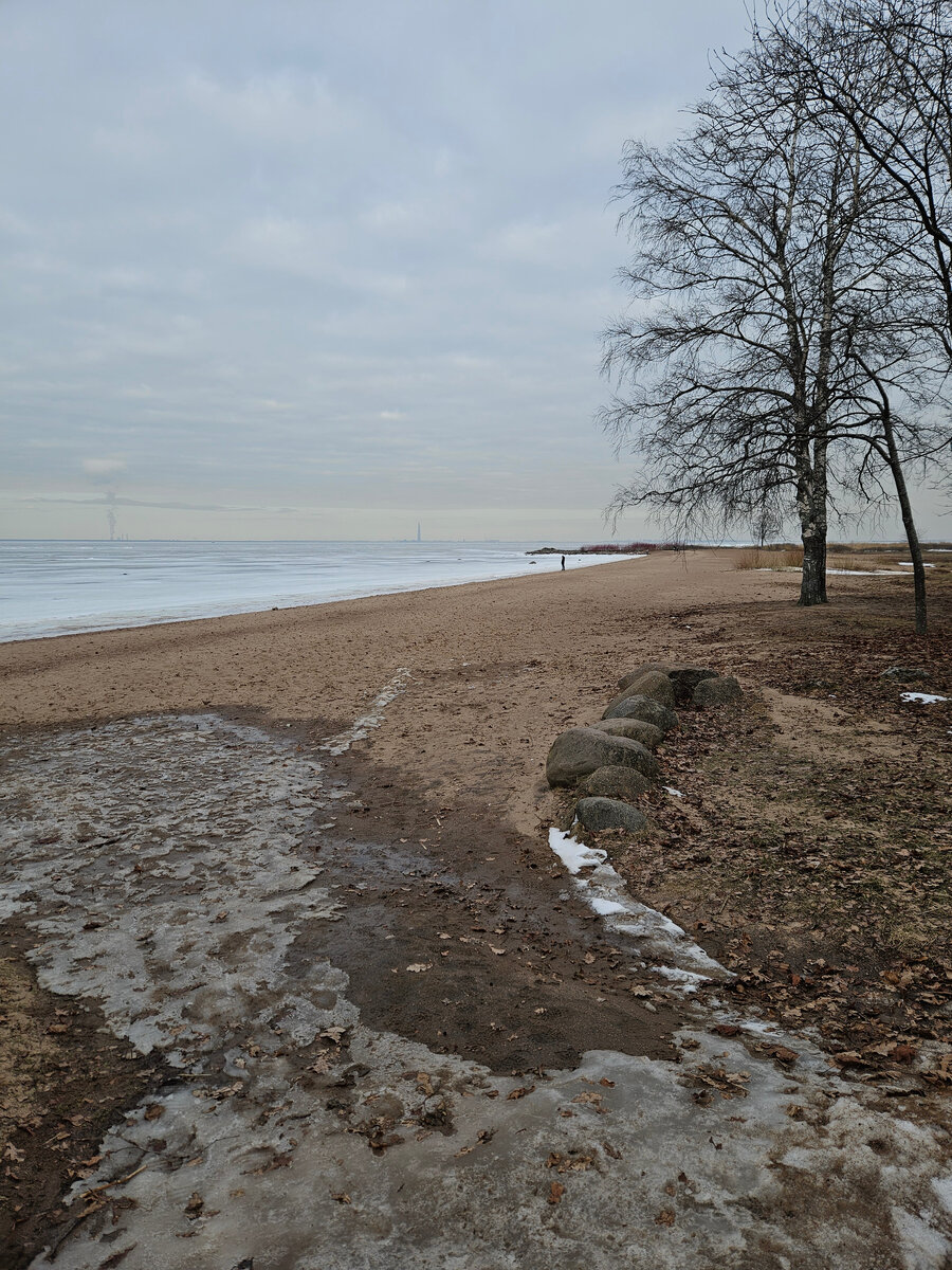 На территории парка есть пляж. Летом много отдыхающих. Официально купаться нельзя, но людей это не останавливает. Можете видеть на том берегу залива небоскрёб Лахта-центра.