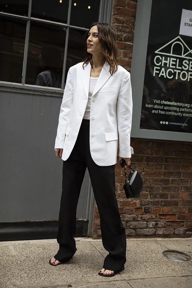 Алекса Чанг в белом пиджаке оверсайз с футболкой под ним, черных брюках со складками и сандалиях.