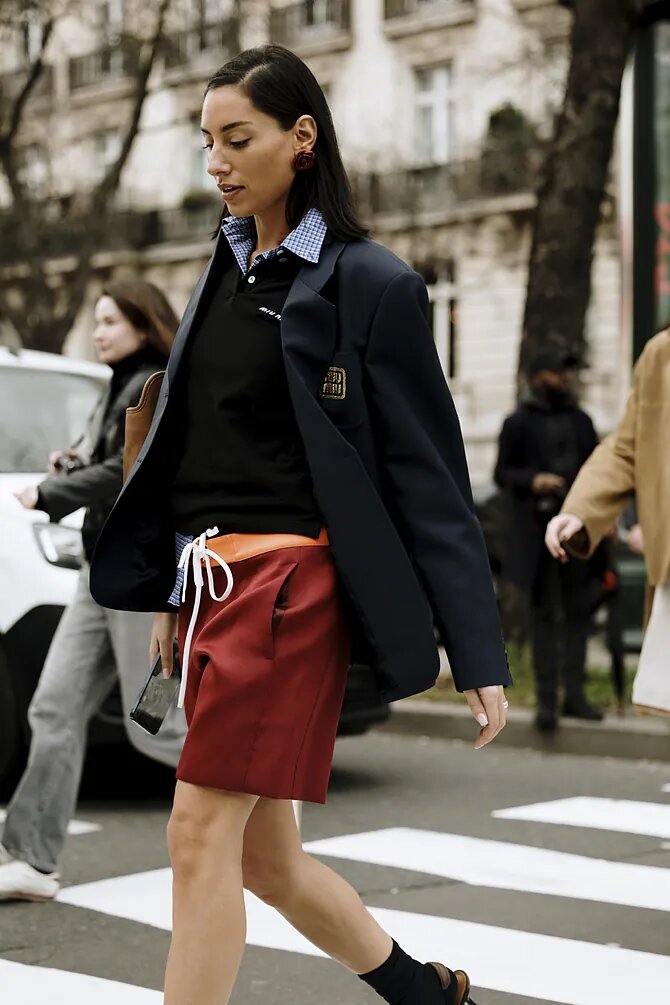 Темно-синий пиджак от Miu Miu поверх клетчатой рубашки и джемпера-поло, бордовые шорты и сандалии с носками. Образ на улицах Милана.