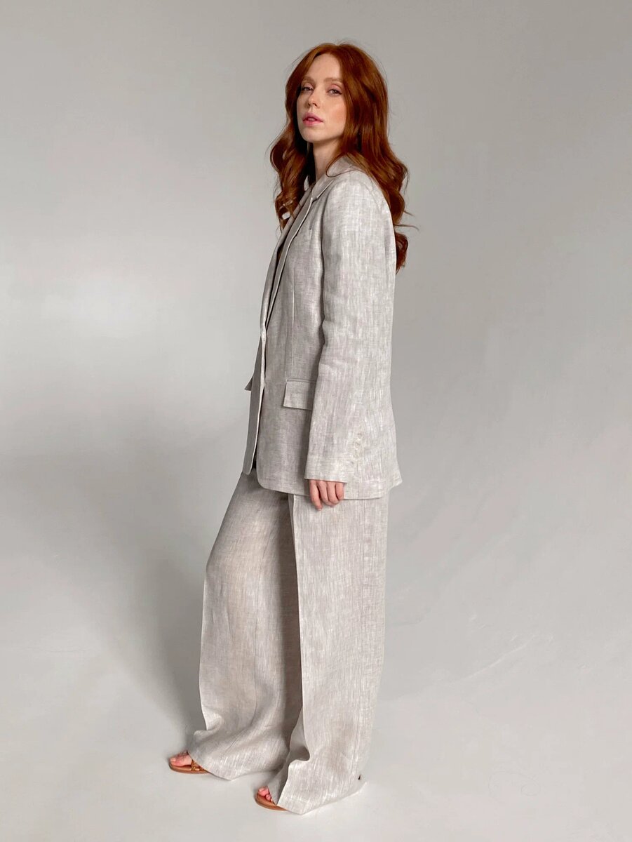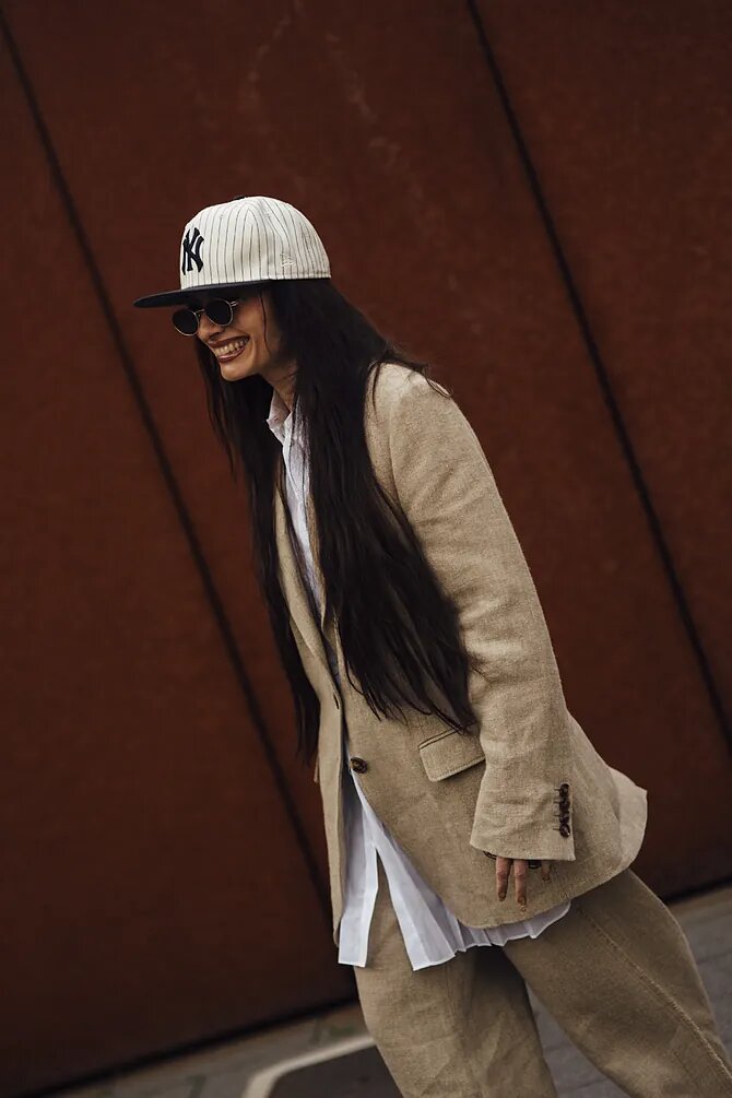 Льняной брючный костюм каменного цвета сочетайте с белой рубашкой и бейсболкой. Нет образа более повседневного и крутого одновременно.