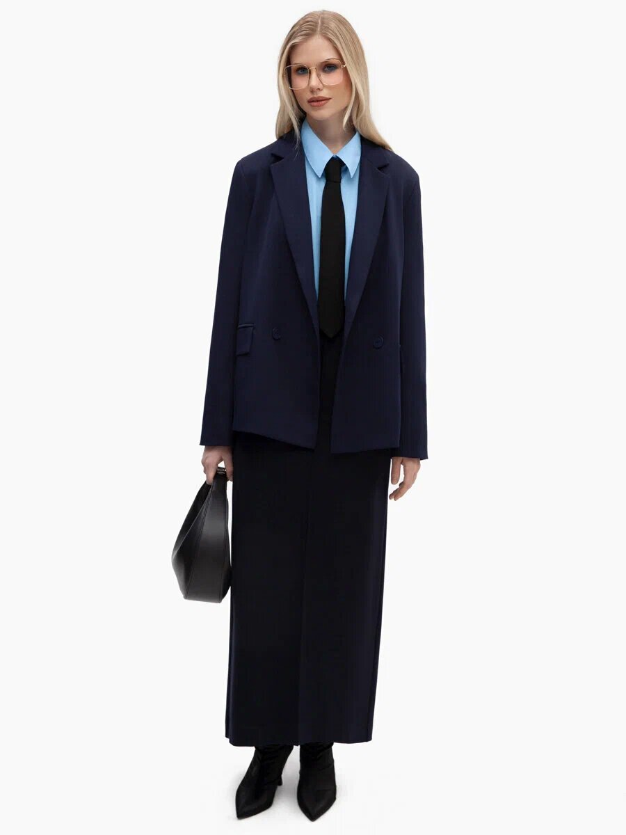 Совет стилиста: Выведите темно-синий пиджак из контекста официальных или студенческих образов . Рискните и наденьте его с белой мини юбкой-баллон с эффектом воздушного шара.