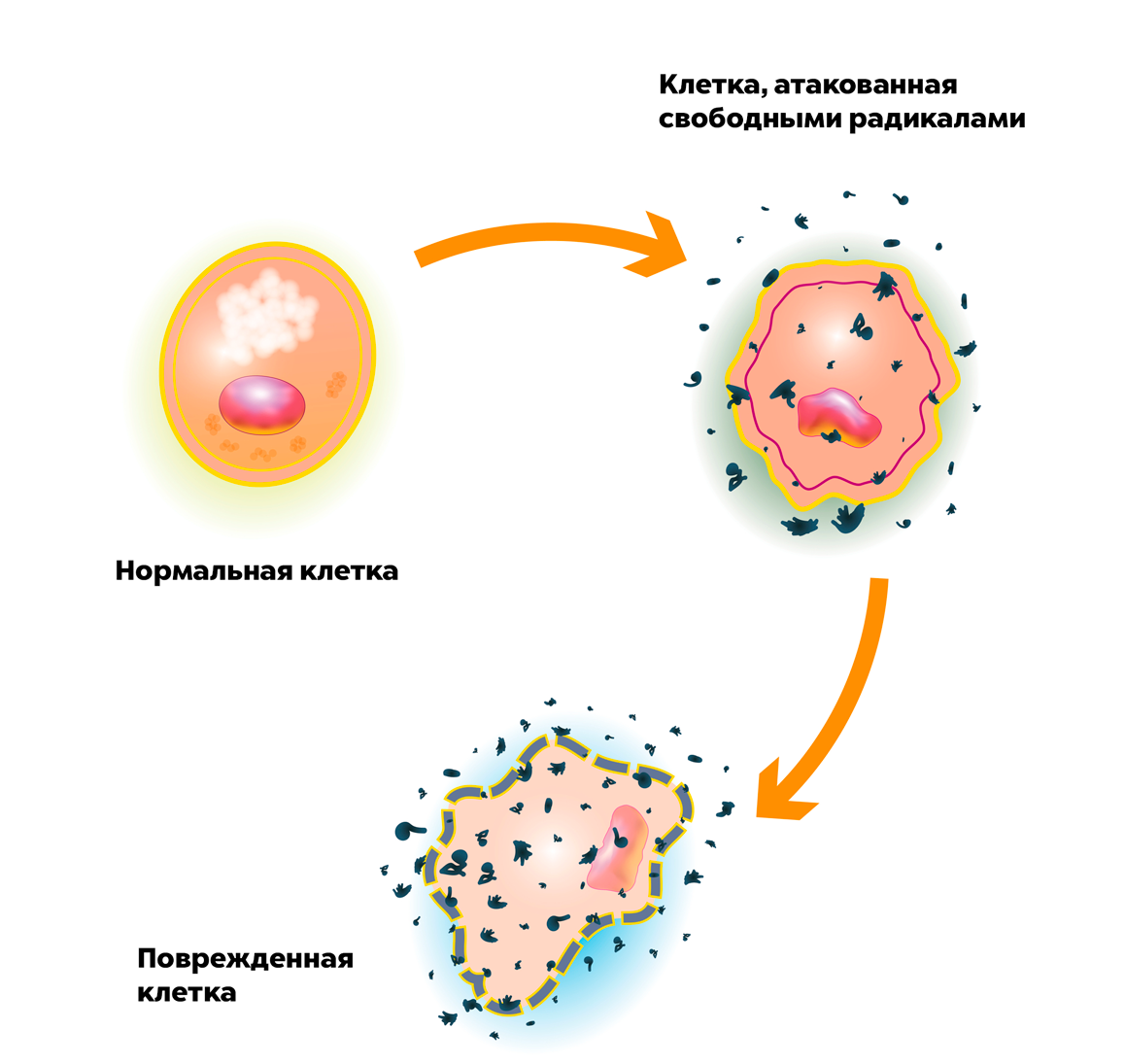 Пока повреждения клеток незначительны, они могут и восстановиться. Примерно то же происходит и с погибшими клетками, благодаря клеточному делению им на смену приходят другие. Но если свободные радикалы повреждают много нуклеотидов ДНК различных клеток, то нормальный процесс клеточного деления уже не в состоянии компенсировать потери. Работа органов человека (других живых организмов) перестает быть нормальной, резко ухудшается здоровье.