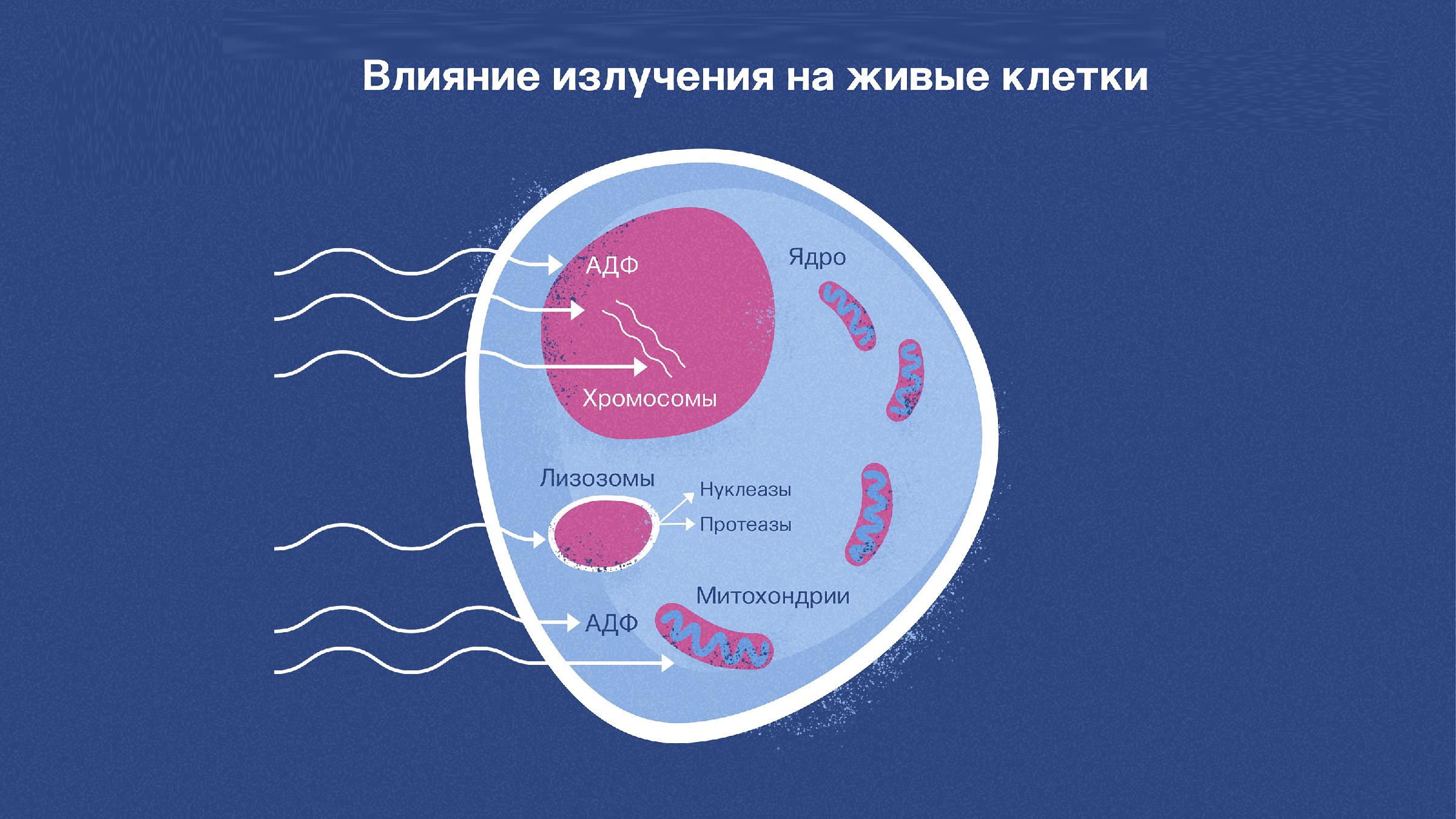 Под воздействием ионизирующего излучения привычная всем Н2О распадается на части Н и ОН. Эти два свободных радикала крайне химически активны, они практически мгновенно вступают в контакт с другими молекулами организма, вызывая в них необратимые изменения, которые могут привести к гибели клетки.