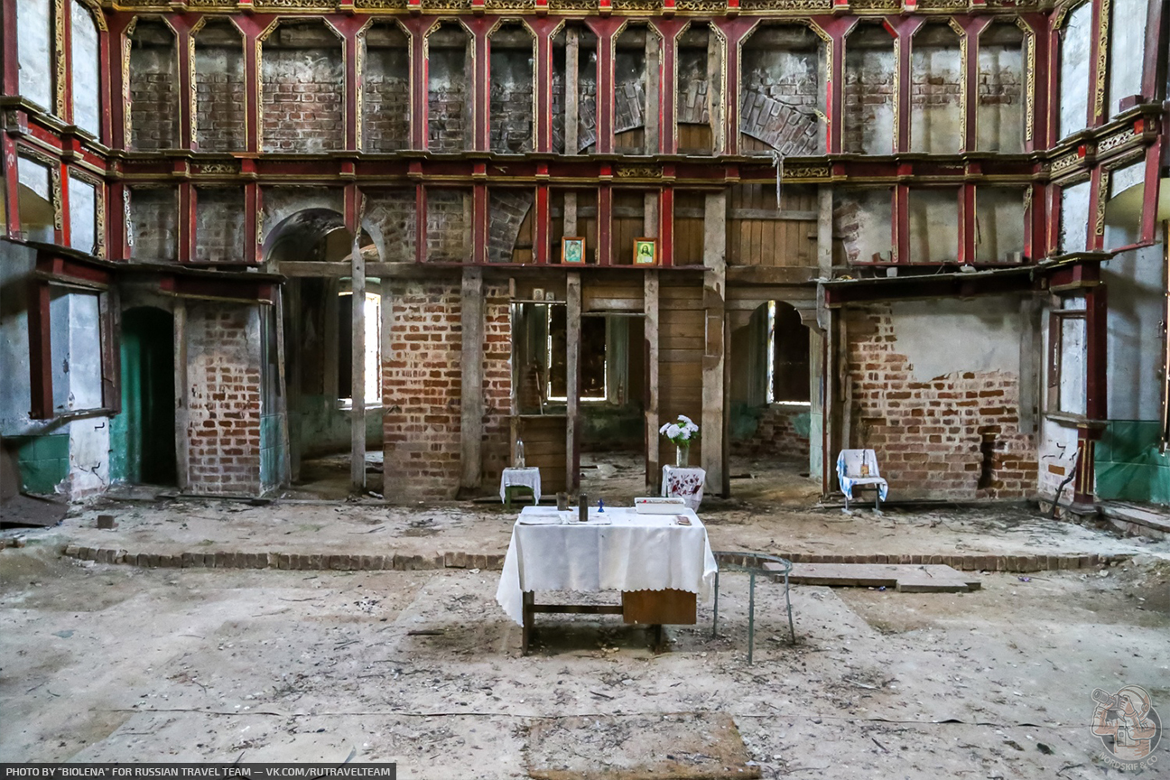 Мы приехали и уехали, а как жили местные я честно не представляю. До ближайшего райцентра — несколько часов пешком, а нормальных автомобильных дорого уже нет. Инфраструктура нулевая. Нет даже магазина. Зато есть старый заброшенный храм, но о нём позже.