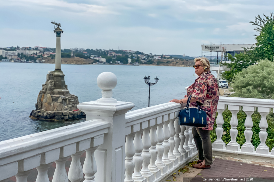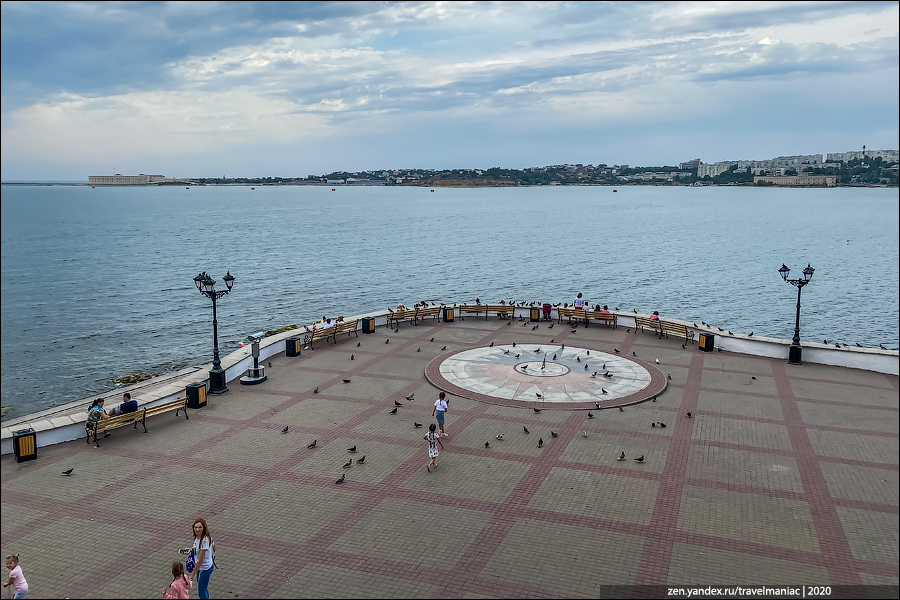 Вот здесь, на смотровой над солнечными часами и с видом на памятник затопленным кораблям всегда полно туристов: они фотографируют и фотографируются, от сюда многие начинают прогулку по набережной или Приморскому бульвару.