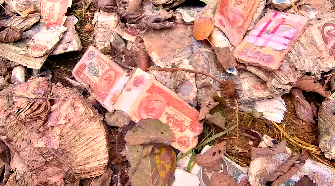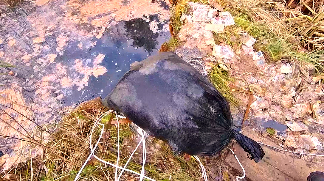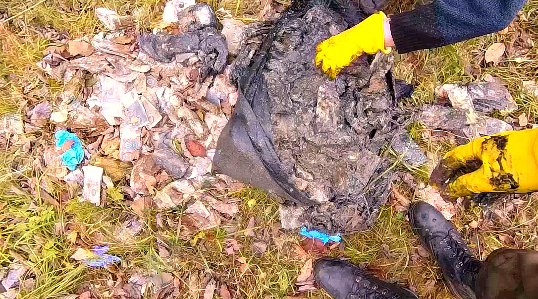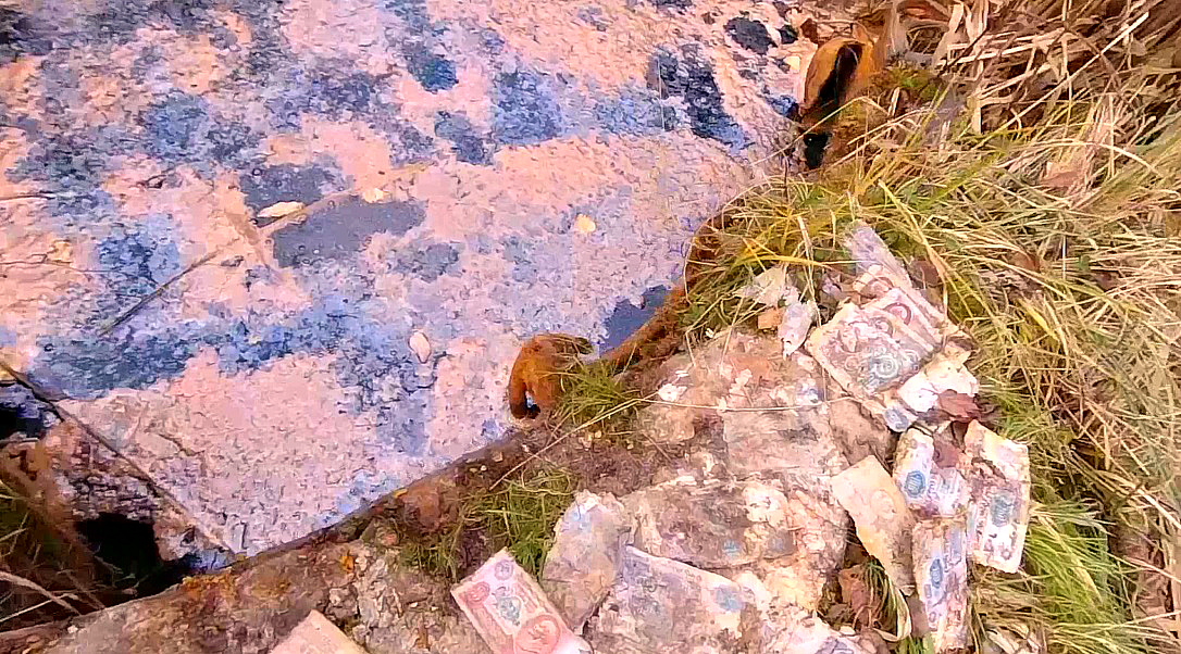 Вскрыв его мы обнаружили советские деньги в грязи с очень, очень нехорошим запахом. Также был обнаружен в мешке песок и мелкая щебенка. Видимо солдаты, которые топили мешки с деньгами сыпали в них песок и камни, чтобы они быстрее тонули.