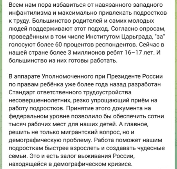 Так вот, в своём Телеграм-канале он опубликовал сообщение, в котором утверждает, что "всем нам пора избавиться от навязанного западного инфантилизма и максимально привлекать подростков к труду".