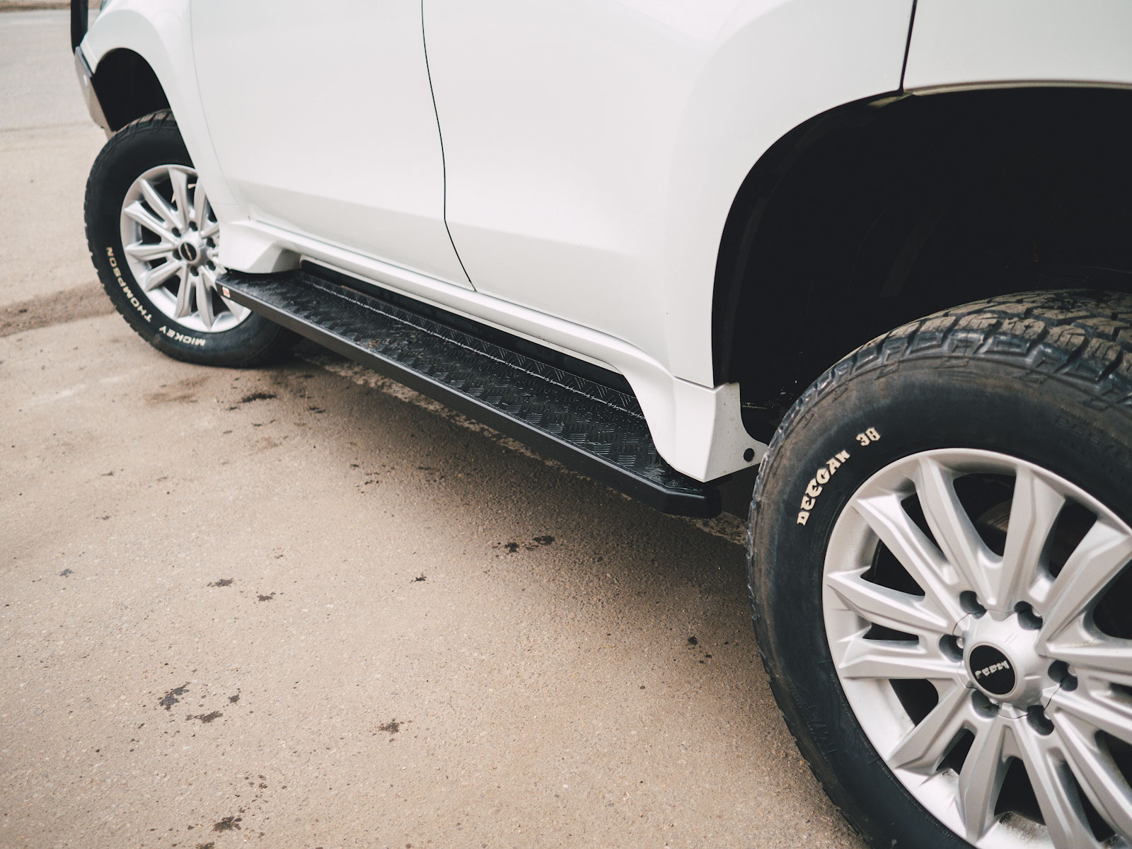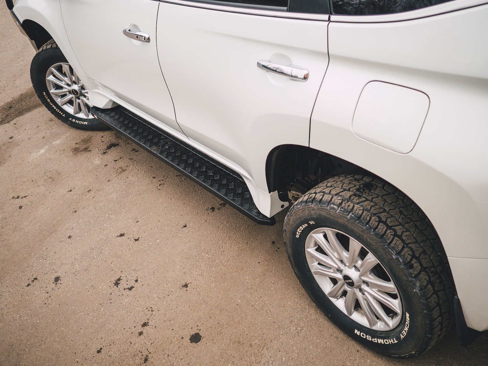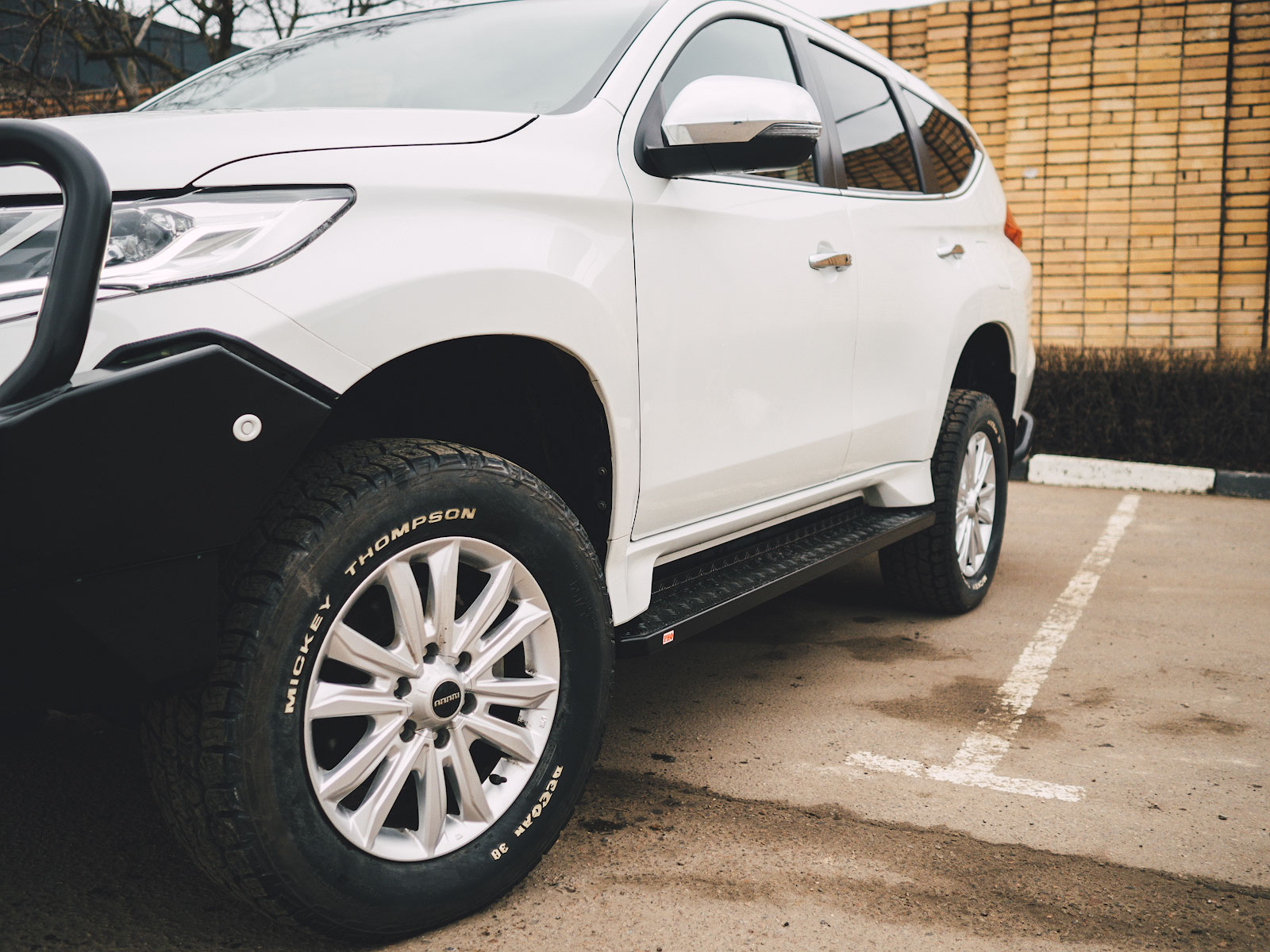 Силовые пороги для Mitsubishi Pajero Sport выполнены в непривычном для РИФ виде — они прямоугольные, что было стилистическим экспериментом для рубленных форм "Спорта". Как по мне, так получилось более чем удачно, пороги как родные, а круглые смотрелись бы убого.