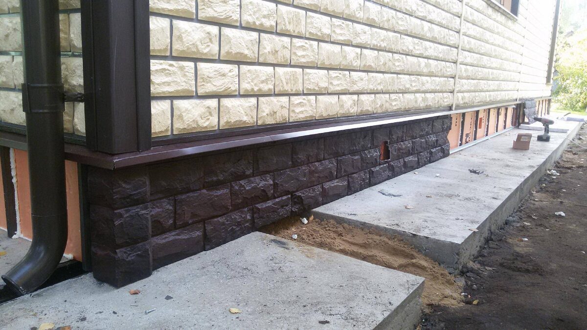 Более легким вариантом является искусственный камень, плитку устанавливают на качественный кафельный клей для наружных работ, предварительно заштукатурив фундамент, выравнивая поверхность и устраняя неровности.