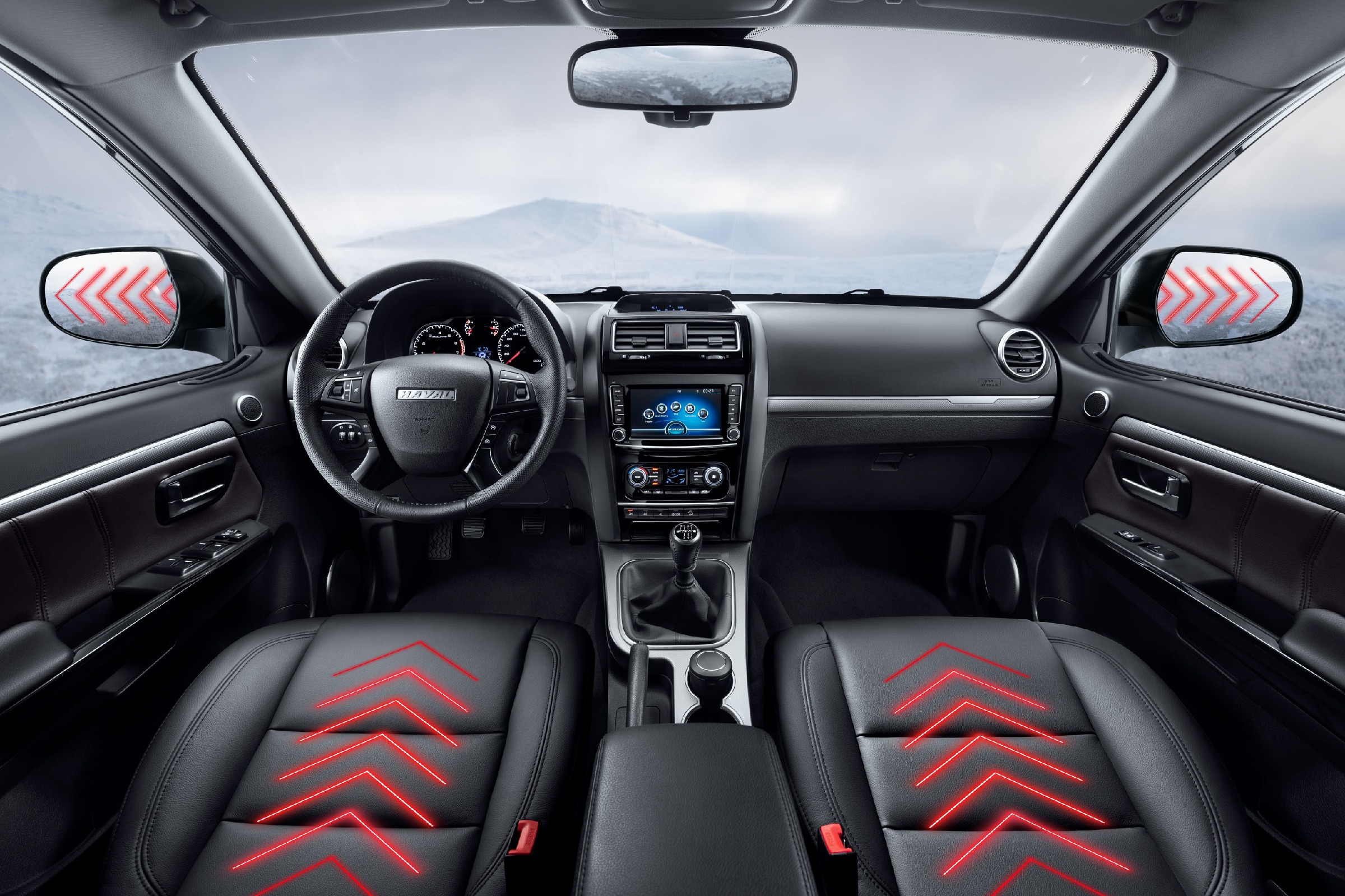 В числе комфортных опций: климат-контроль, круиз-контроль, подогрев сидений, задние парктроники, мультимедиа и джиперские приборы с альтиметром, компасом, «кренометром» и барометром.
