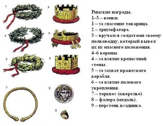 Следует отметить, что награды в форме короны появились только в поздней Империи, в то время как триумфаторам во времена Республики давали венки из различных растений, таких как дубовые, лавровые и др. Эта традиция сохранялась и при правлении императоров, которых часто изображали в триумфальных венках.