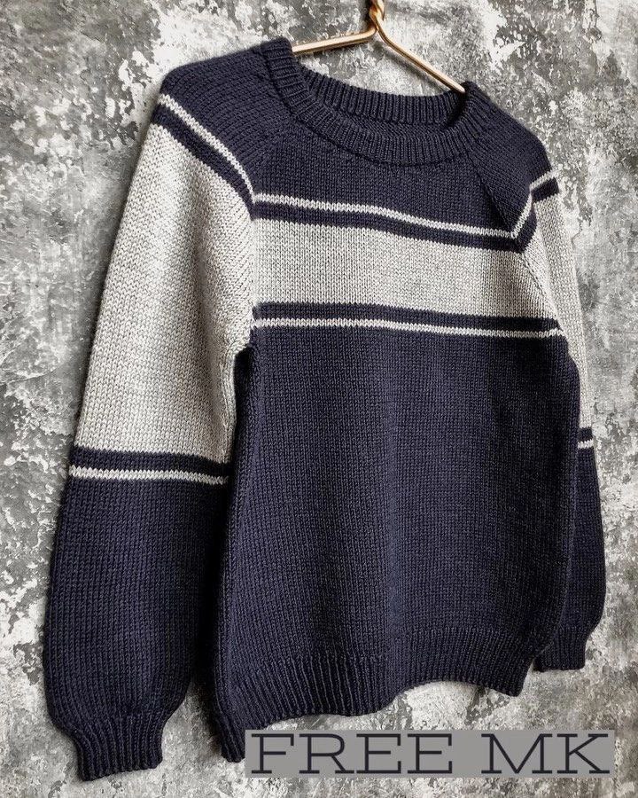 Уютный свитер глубокого синего цвета с широкой полосой светло-серого оттенка и тонкими акцентами, изготовленный из плотной и мягкой пряжи. Его отличительная черта — комбинированный узор на рукавах и груди, формирующий стильный и современный вид.