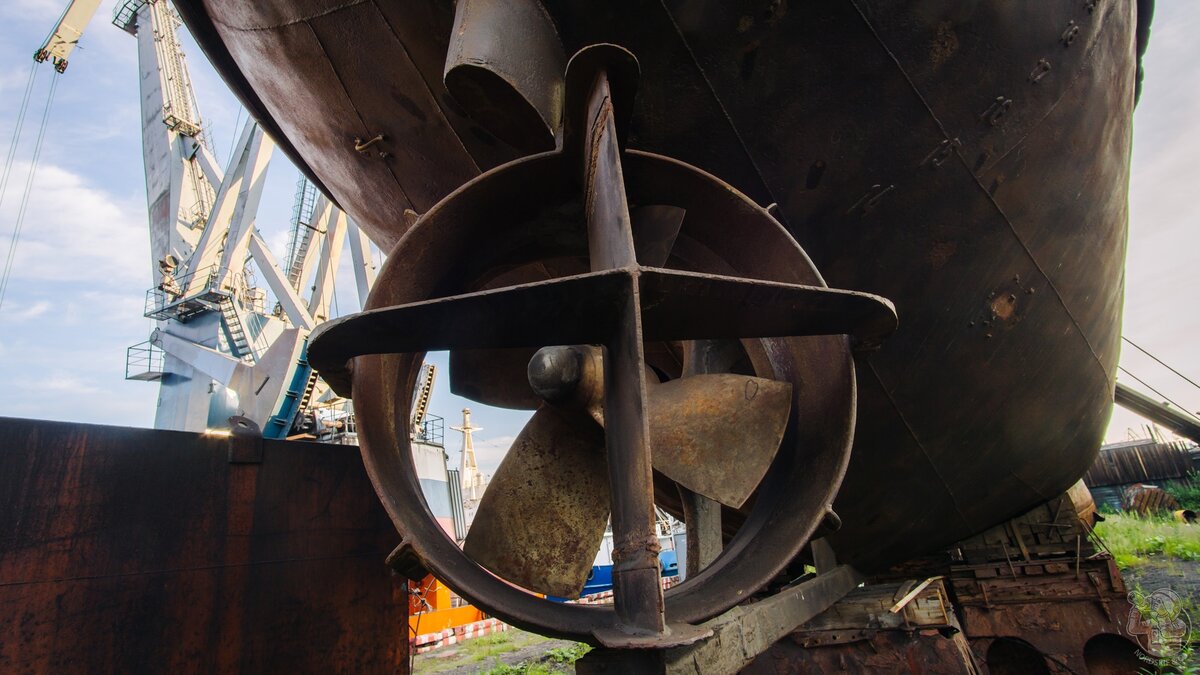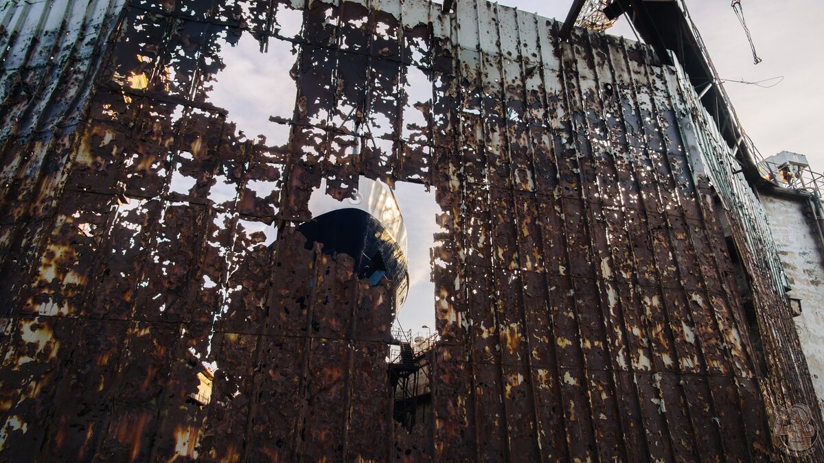 Жемчужина нашей прогулки скрылась за высокими ржавыми воротами. Эти громадные створки, судя по виду, испытали все возможные невзгоды, какие только могут прийтись на долю металлических листов. Они были изъедены суровыми северными ветрами с привкусом морской соли, раз за разом отражая натиск воды и влажного морского воздуха. Сквозь остатки железа пробивался нос свежеокрашенного корабля.