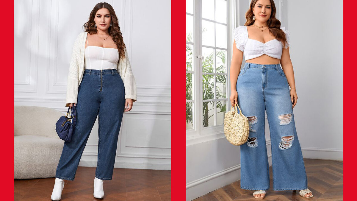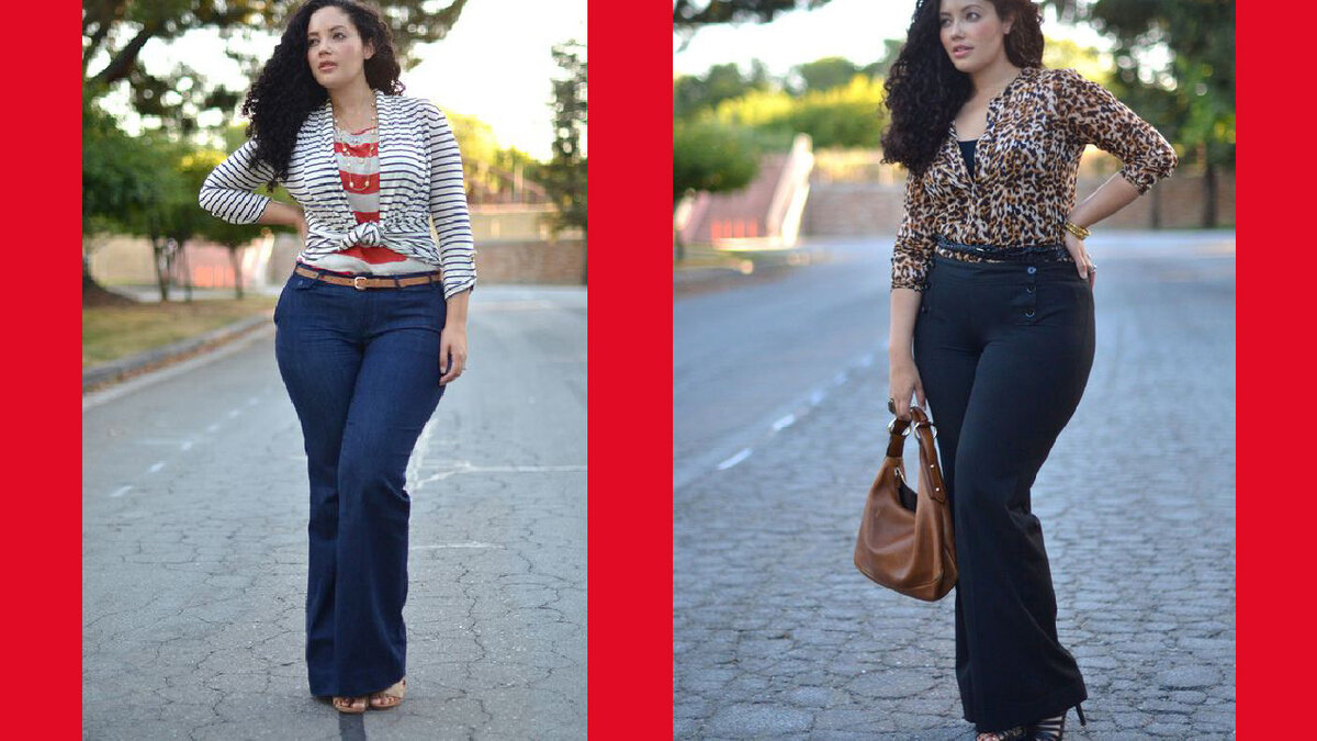 Итак, на полных женщинах лучше всего будут смотреться джинсы прямого кроя с высокой посадкой. Причём, темный цвет визуально сделает бедра уже. Модные в этом сезоне широкие штанины тоже помогут скрыть полноту.
